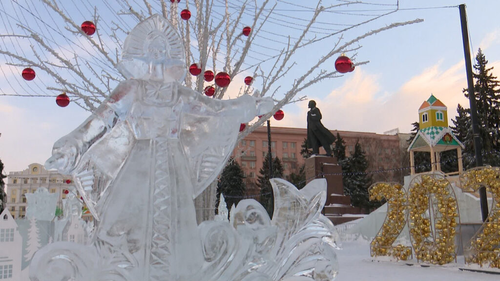 Отметим, что ледовый городок на площади Революции посвящен теме «Малахитовая шкатулка». Установлены ледяные скульптуры золотоискателей, каменного цветка, Великого Полоза, его дочери и других героев произведений уральского писателя Павла Бажова. Построены несколько горок, в том числе большие.