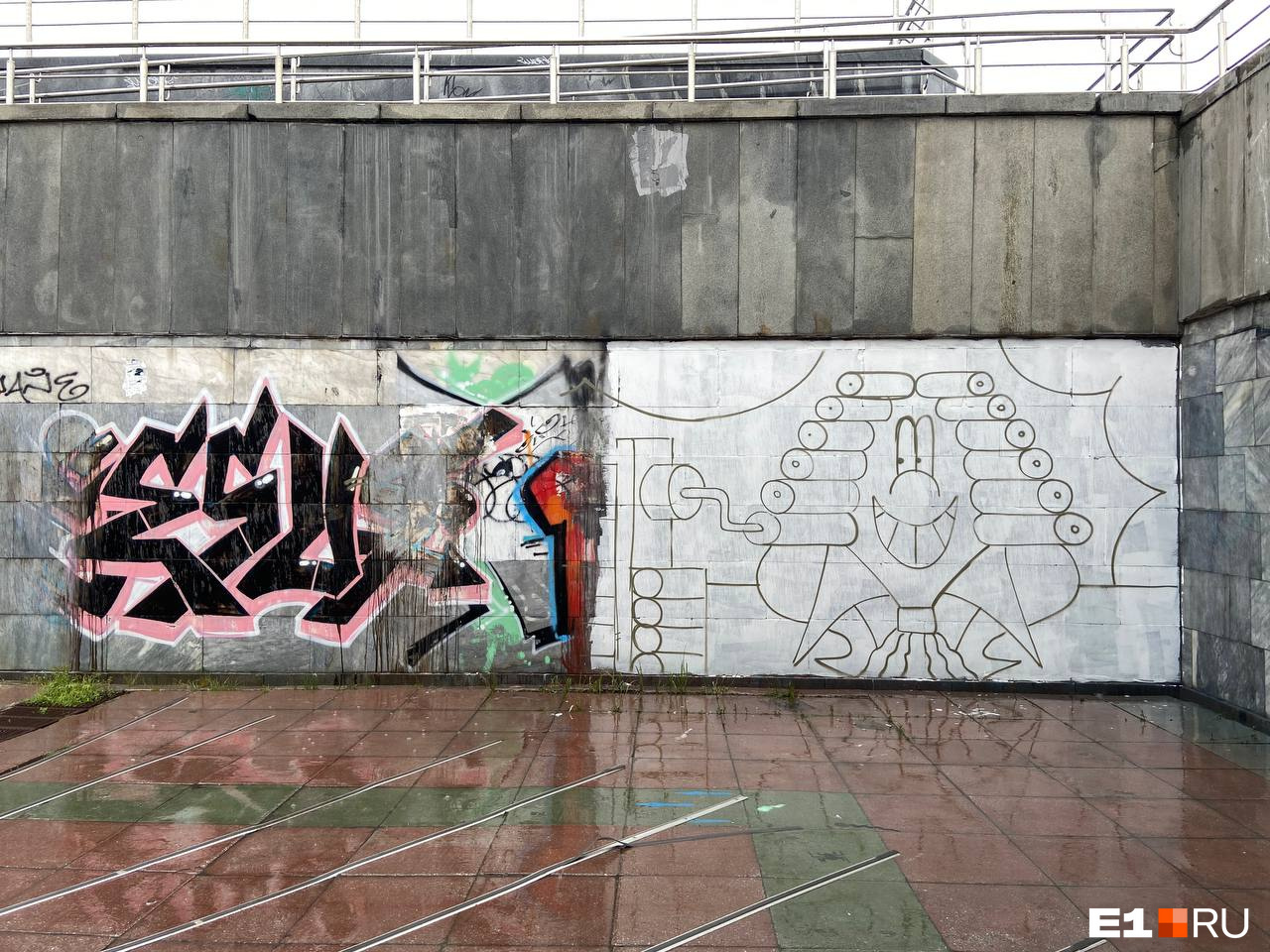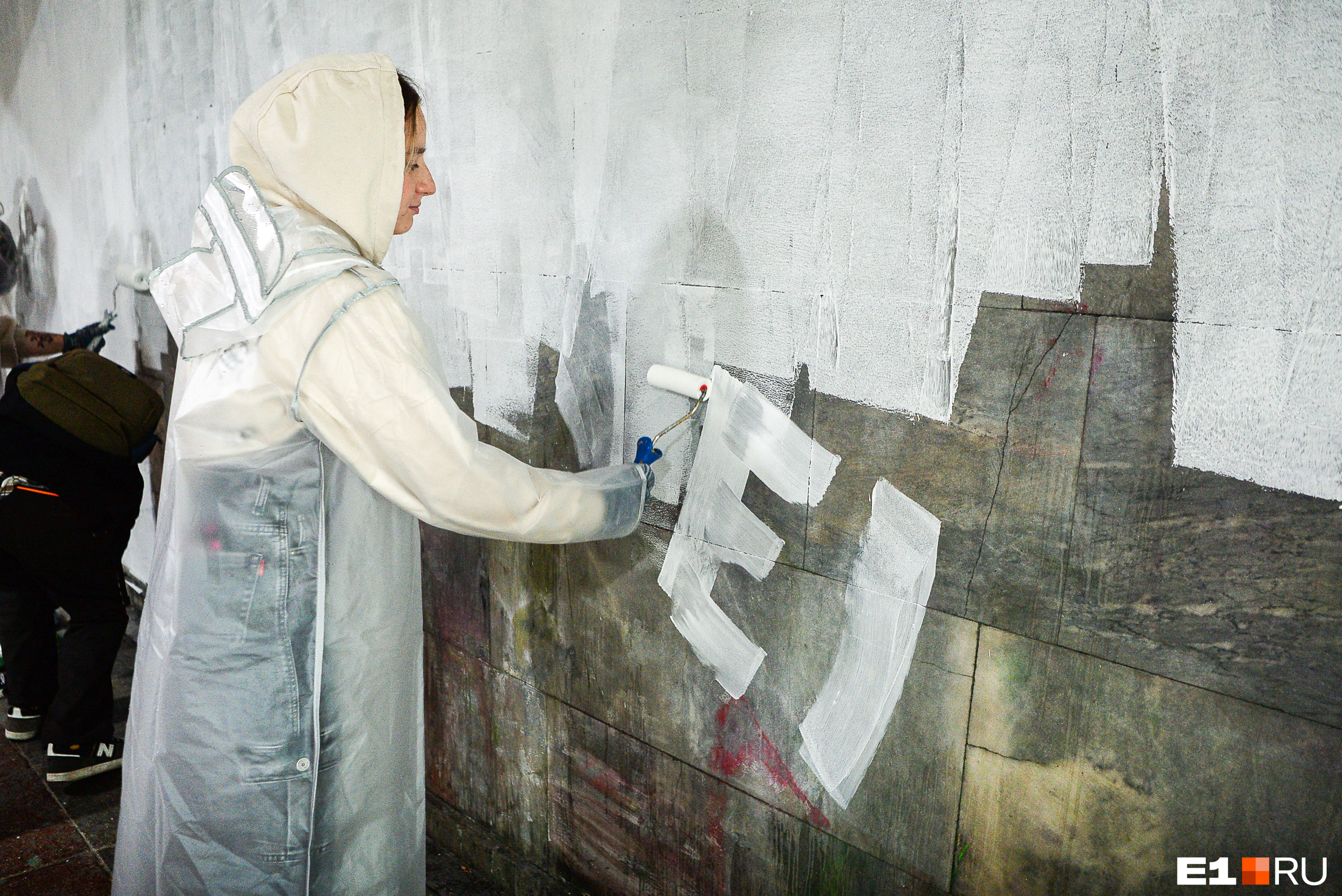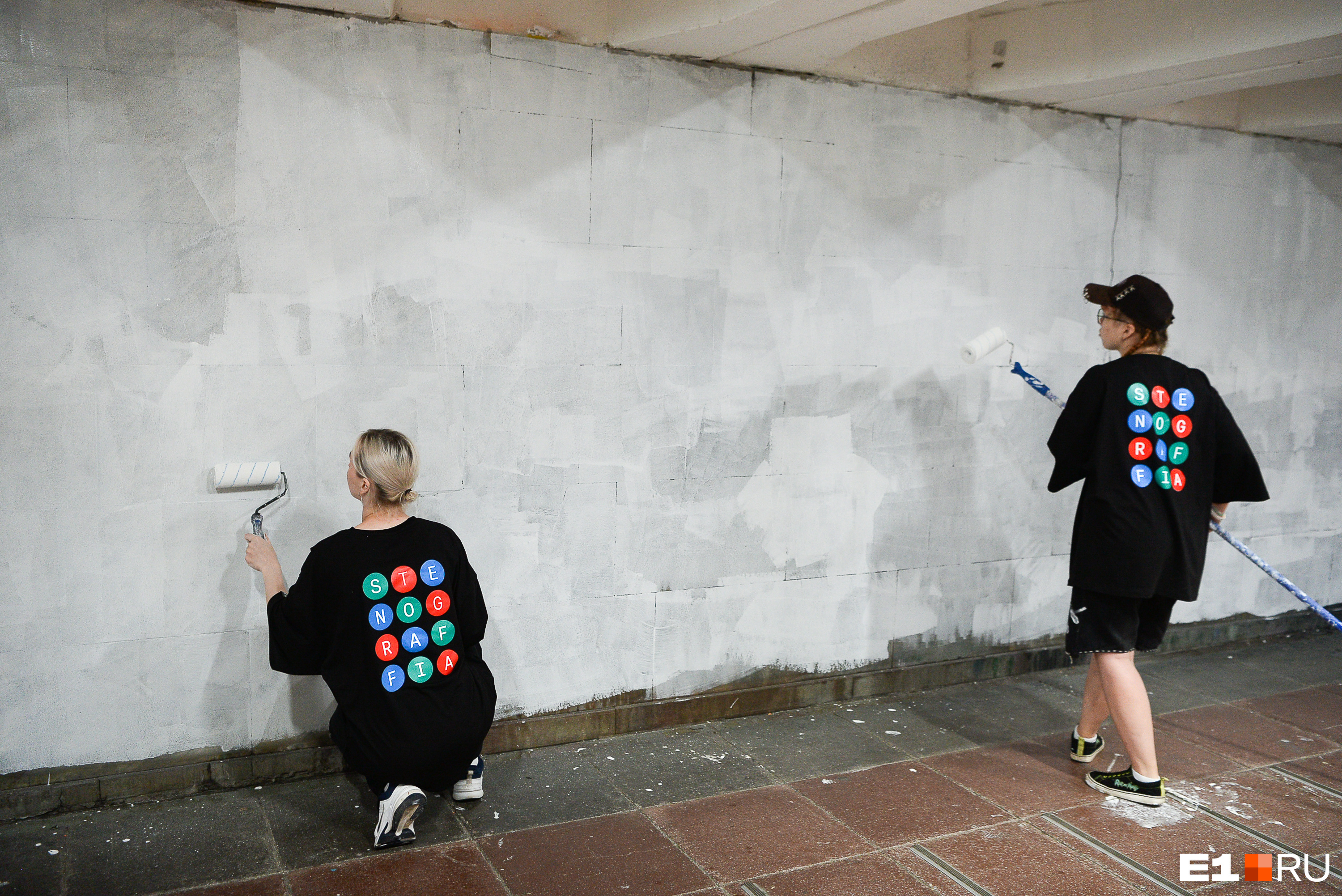 — Сейчас у нас проходит подготовка объекта: первый этап — очистка: пространство покрыто шрифтовыми композициями, которые портят вид. Мы хотим преобразить эту территорию для горожан, часть стен была отчищена от слоев краски, — рассказала Анна Клец, руководитель фестиваля. — К сожалению, краска испортила покрытие мрамора, она сильно въелась, ее невозможно полностью отчистить. Мы решили защитить этот переход и сделать изображение, которое будет отражать историю города.