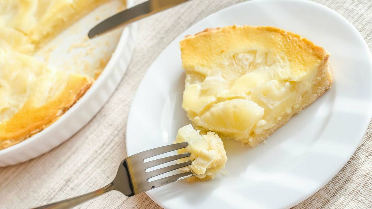 5․ Сверху выложите целые кольца ананасов, немного вдавите их в творожную массу. Готовьте запеканку 35–45 минут до золотистого цвета.
