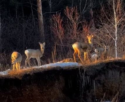 В кадр попали сразу пять косуль: они прогуливались вдоль дороги. Видео было снято недалеко от села Колмогорово.