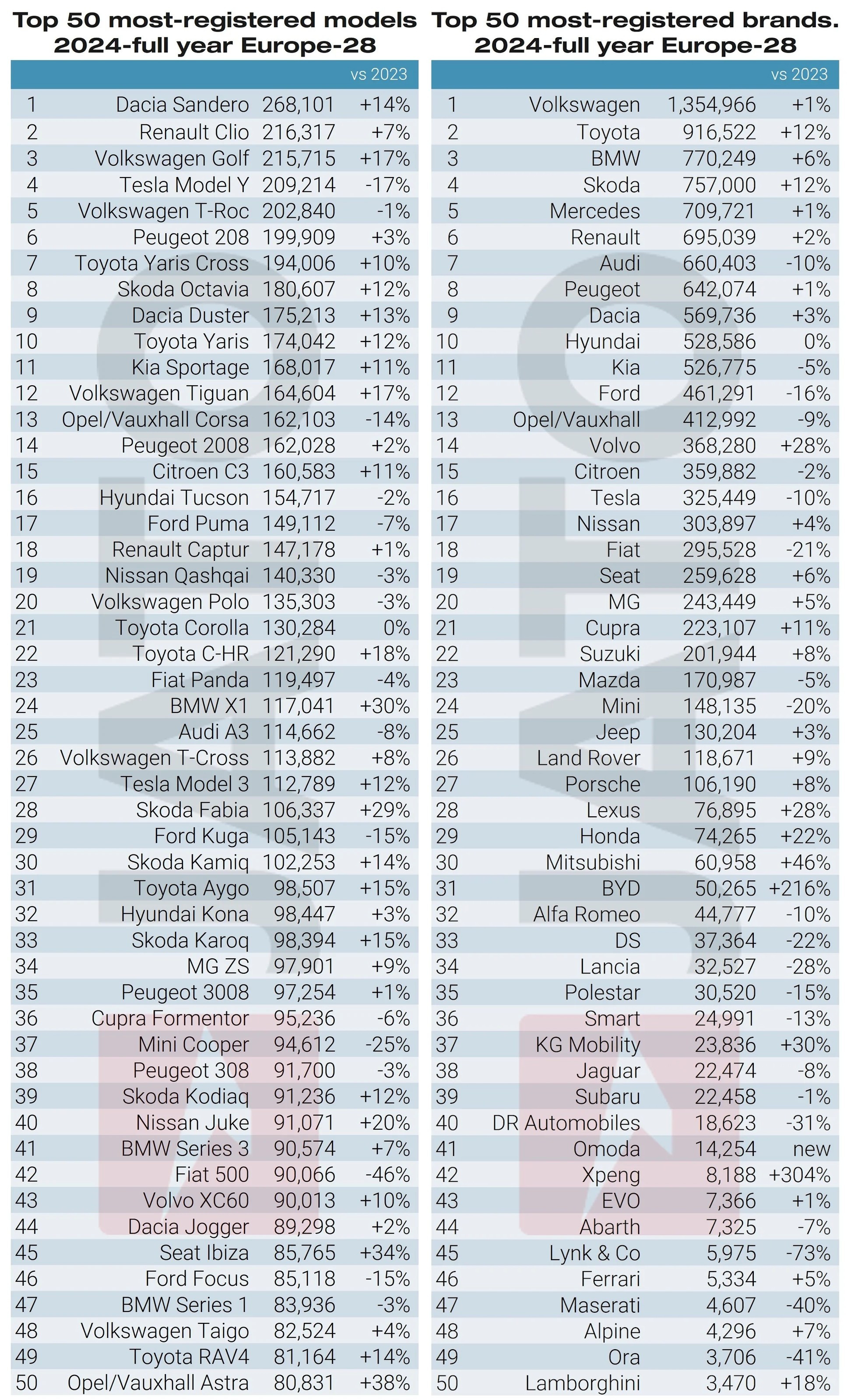 Для простоты изложения мы будем отождествлять регистрации с продажами: всего за прошлый год, по данным JATO Dynamics продажи новых легковых автомобилей в Европе составили 12 909 741 шт., что на 0,9% больше продаж в 2023 году. Далее приводим списки 50 самых популярных моделей и брендов.