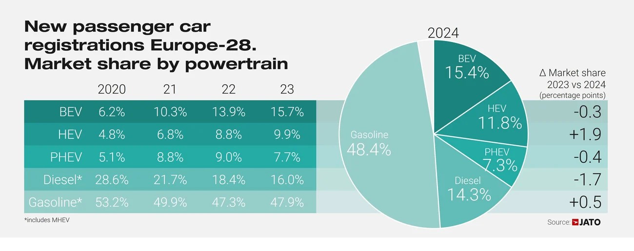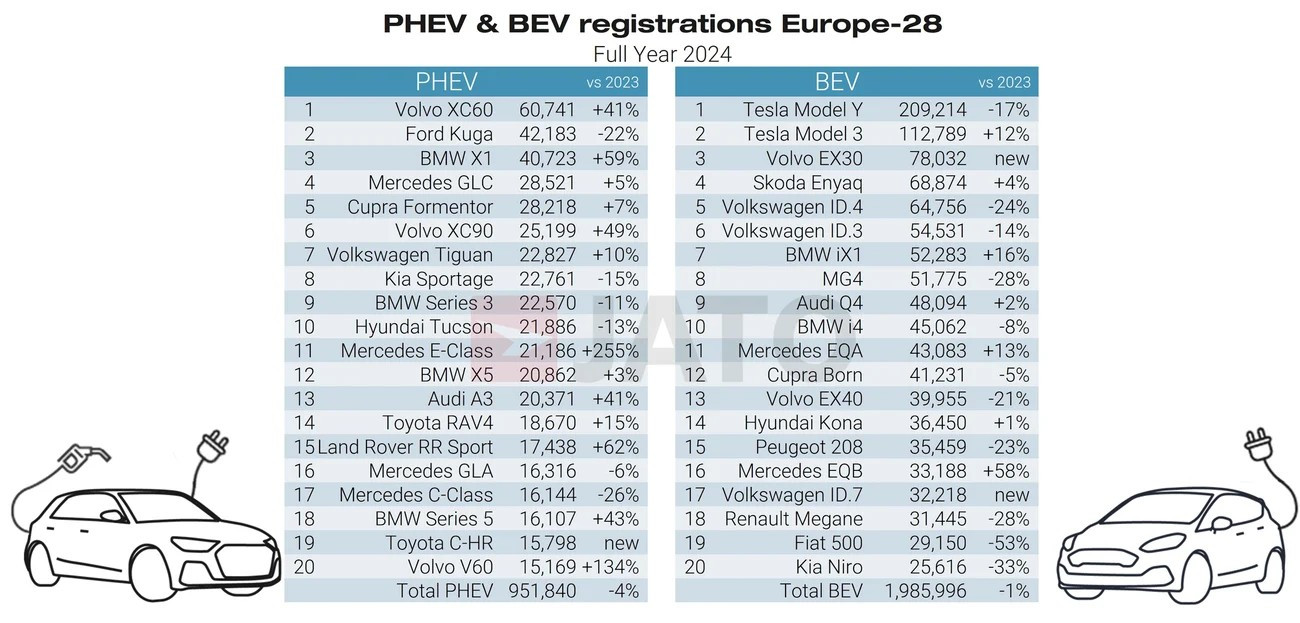 Продажи электромобилей в Европе в прошлом году сократились на 1,2% до 1 985 996 шт., а их доля в общем объёме продаж уменьшилась с 15,7% до 15,4%. Подключаемые гибриды (PHEV) тоже сдают позиции: их доля на рынке уменьшилась с 7,7% до 7,3%. Продажи обычных, безрозеточных гибридов (HEV), наоборот, резко пошли вверх (+21% по сравнению с прошлым годом), их доля на рынке выросла с 9,9% до 11,8%.