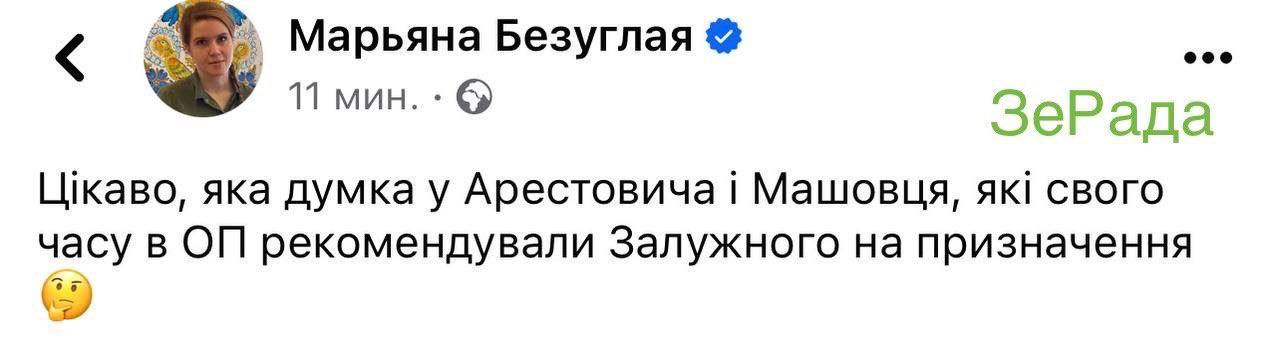 Примечательно, что после заявлений Безуглой о том, что Залужный не имеет плана войны на 2024 год на нее накинулись не только "порохоботы" (более чем лояльные к главкому ВСУ), но и "соросята" (отрабатывающие западную повестку), а главное что "свои" (например, представитель президента в Раде Вениславкий, спешно открестился от обвинений Безуглой в адрес Залужного). Но ведь ровно о том же, о чем говорит Безуглая пару дней назад заявлял и Арахамия — он подчеркивал, что "в Верховной Раде ждут от Генштаба плана войны, а его нет".