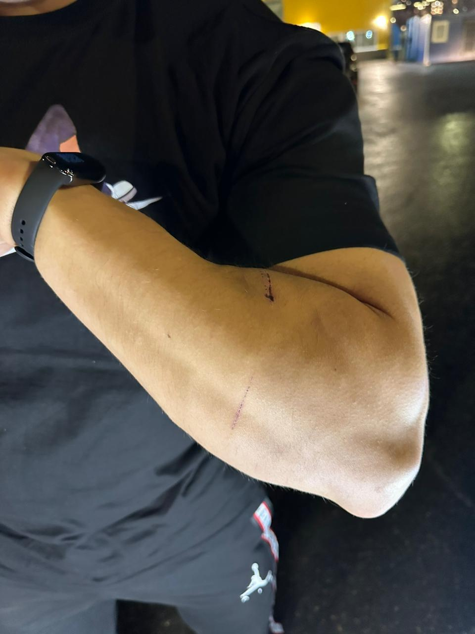 — Одна из них просто подрывается и прямой удар ему наносит, он, конечно, в шоке, начинает этих двух девушек выводить. Пока он их выводил, подключилась еще их третья подруга. Я стоял на входе, мне сказали, что сегодня им всё, [не пускать]. И высокая девушка мне говорит: «Мне типа вообще [мат]» — и через меня и еще одного парня проскальзывает. И забегает туда внутрь. Я ее останавливаю за руку и говорю: «Девушка, у вас сегодня уже не получится пройти в заведение, заберите верхнюю одежду». Она меня просто прямым текстом... послала и расцарапала мне руку. Для того чтобы ее обезопасить от себя, и от физической боли, которую она мне предоставила, я ее просто поднял двумя руками, унес туда, где выход, и выбросил ее за дверь, — пояснил нам мужчина.