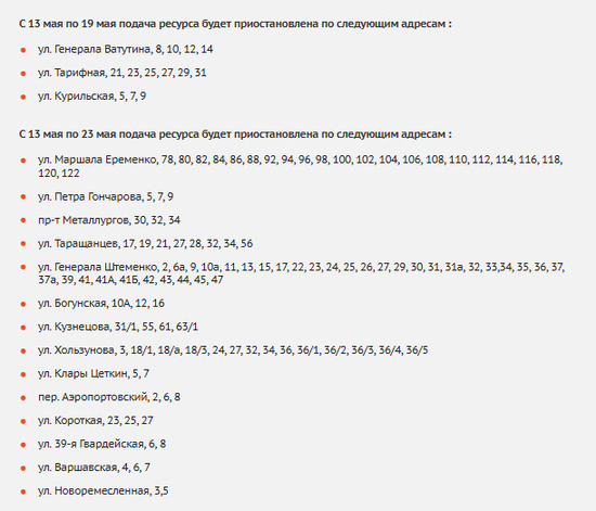 В Кировском районе с 15 по 27 мая без горячей воды останутся жильцы следующих домов: