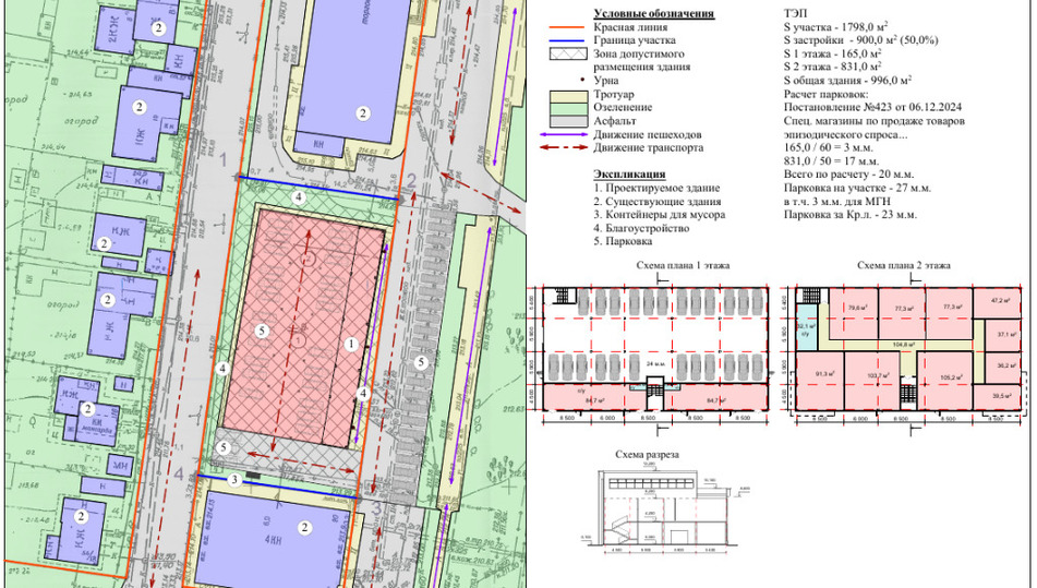 Проект предусматривает строительство двухэтажного здания общей площадью 996 квадратных метров. Первый этаж займут торговые помещения, рассчитанные на магазины и предприятия обслуживания. На втором разместятся офисные и административные помещения.