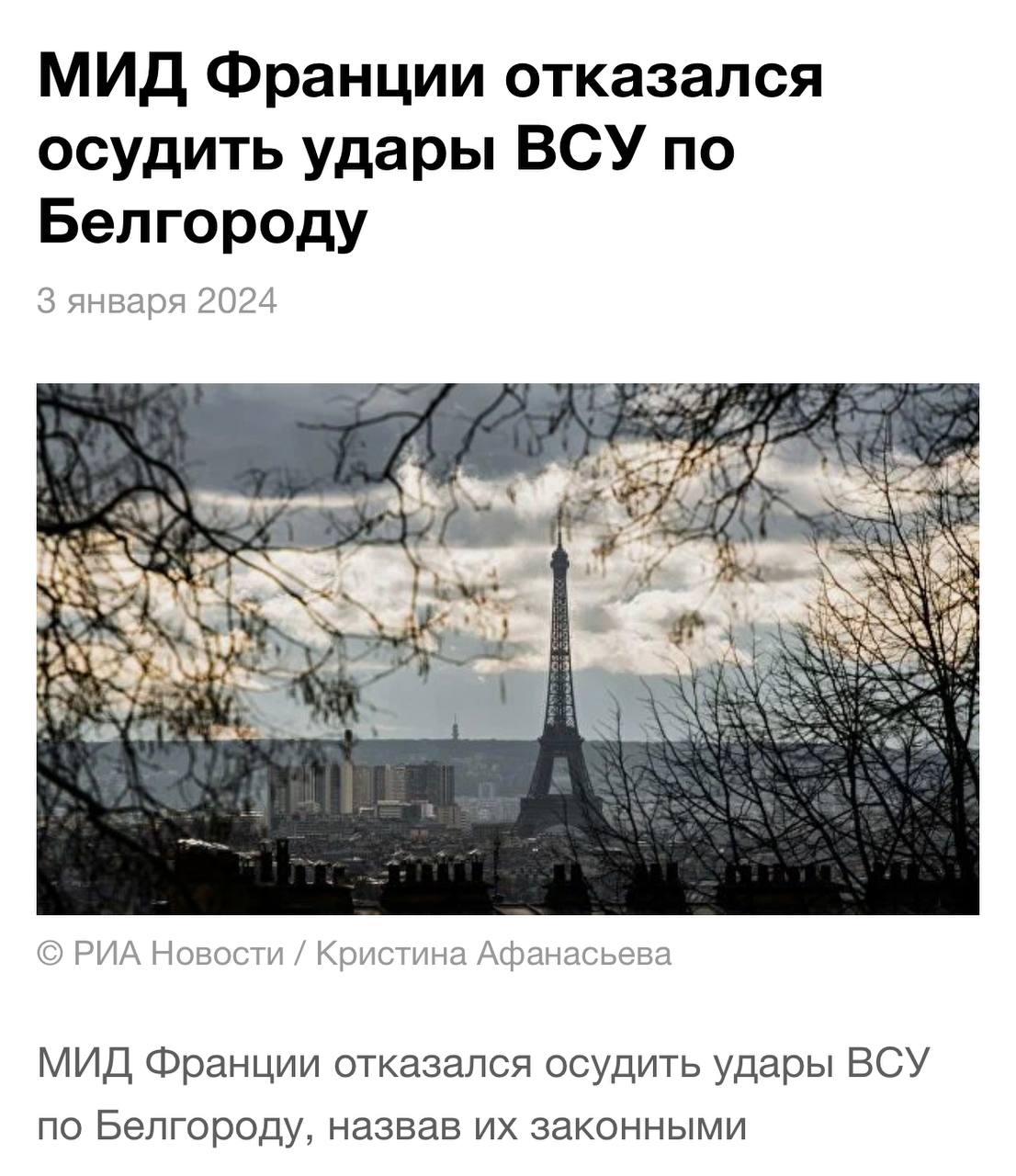 На ежедневном брифинге журналисты попросили внешнеполитическое ведомство обозначить позицию Парижа относительно ракетных ударов ВСУ по Белгороду с применением запрещенных кассетных боеприпасов.