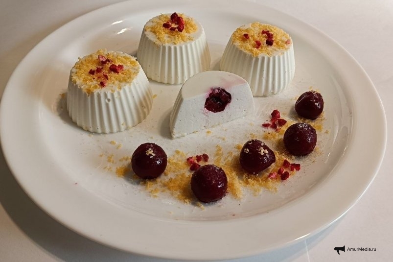 Подогреть молоко в микроволновке, развести в тёплом молоке желатин. Дать настояться. Влить молоко с желатином в творог, добавить ванилин, подсластитель и всё тщательно взбить блендером. Полученную массу распределить по формам. В серединку положить вишенку. Можно украсить кокосовой стружкой. Убрать в холодильник на несколько часов.