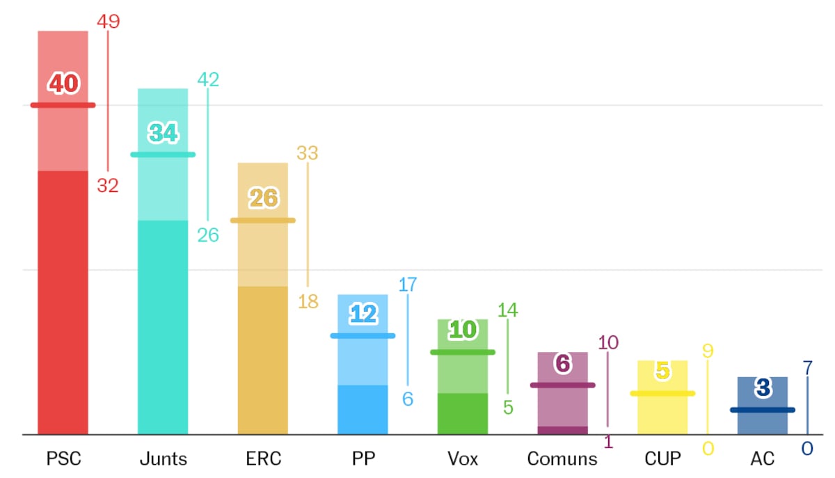 ¿Qué Gobierno saldría de un resultado así? Es difícil decirlo. La llave pasaría por soluciones exóticas, o que contradicen lo dicho por algún partido, como un pacto de Junts y PSC, un apoyo de la CUP a los socialistas, o un acuerdo de los independentistas con Aliança Catalana. Todo eso parece improbable. Por eso no es descartable un bloqueo y una posterior repetición electoral.