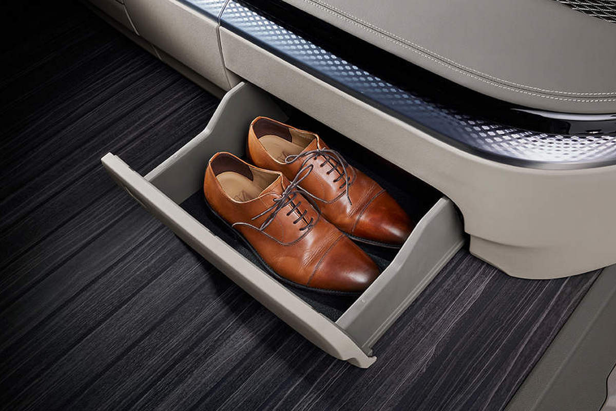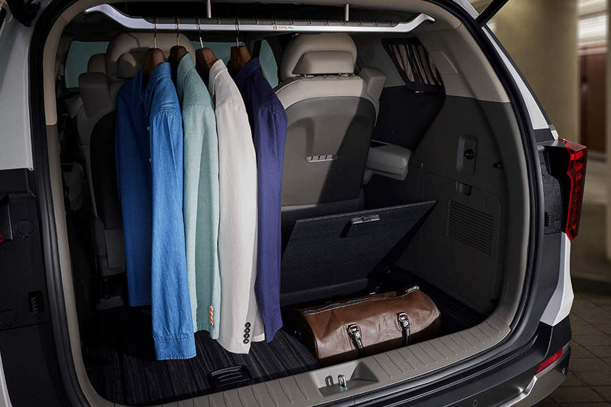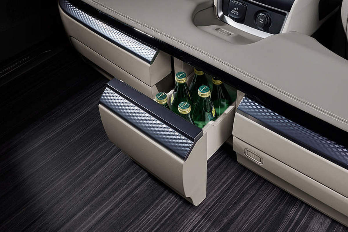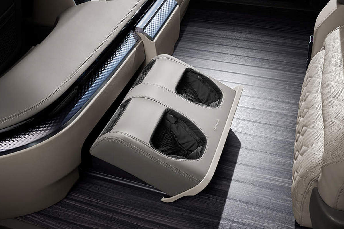 На полу четырехместного минивэна – «ламинат». Кроме того, перед VIP-пассажирами имеется три выдвижных бокса: это массажер для ступней, холодильник и ящик для хранения. Наконец, в багажнике установили штангу, на которую можно повесить одежду, плюс в подполье есть пара дополнительных отсеков.