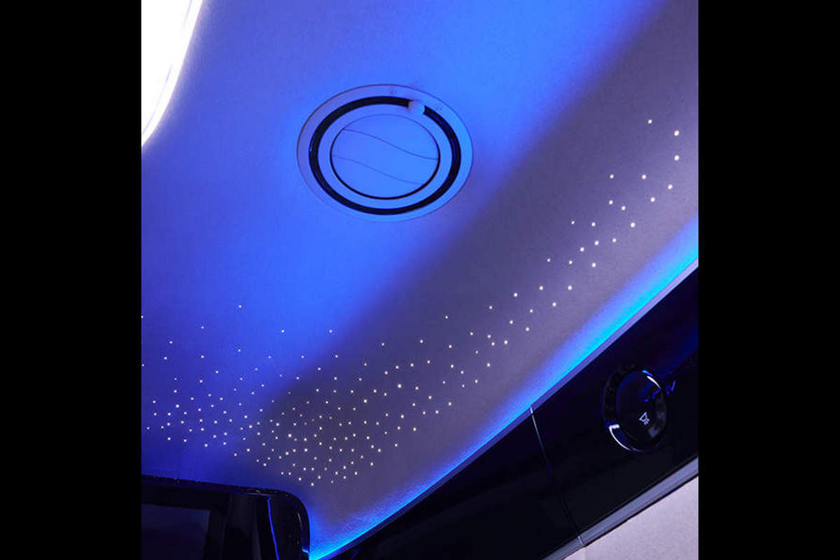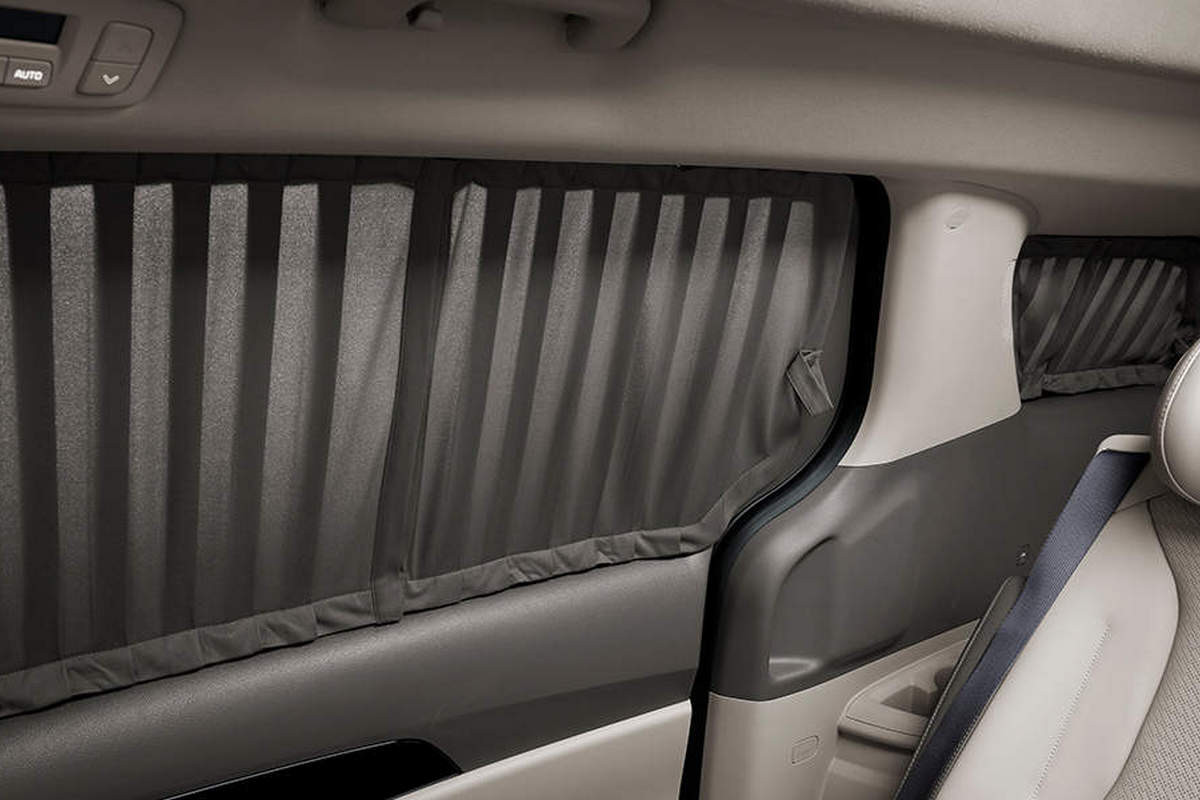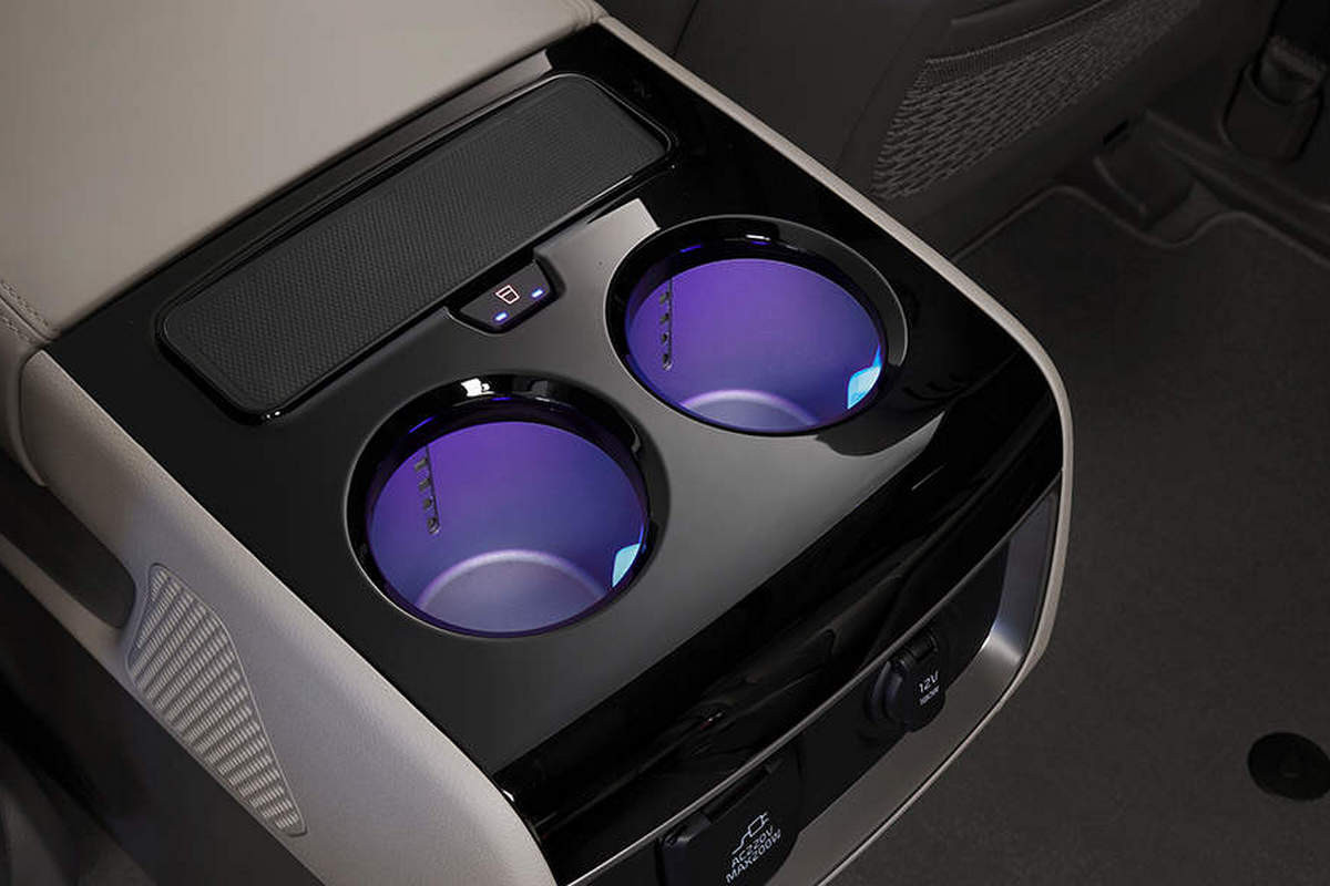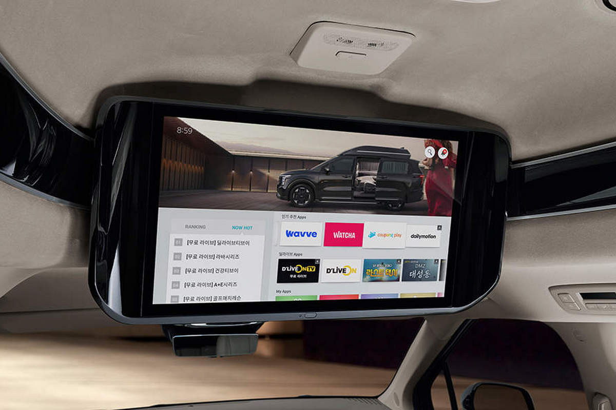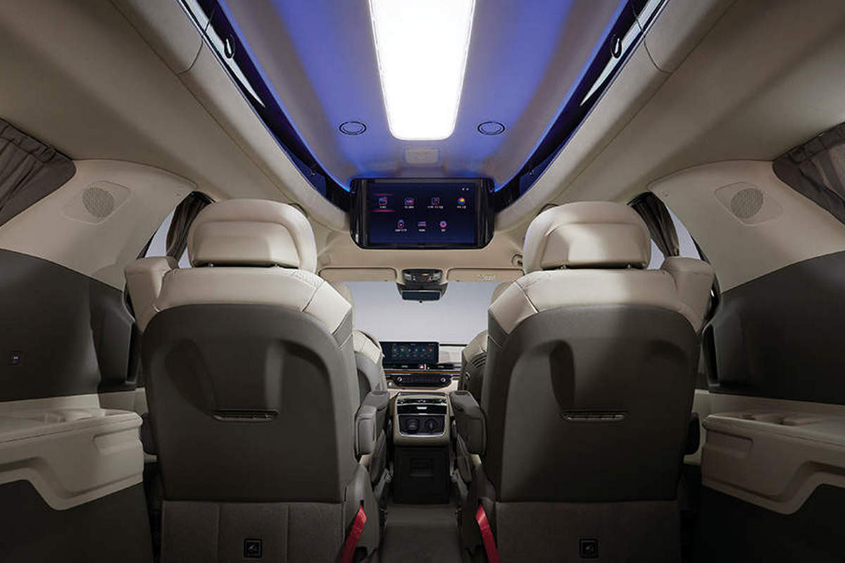 Как и прежде, базовый Kia Carnival HiLimousine имеет 9-местный салон, на ступеньку выше – 7-местная версия. На окнах таких машин есть занавески, в основание расположенного между передними креслами подлокотника встроены подстаканники с функцией подогрева и охлаждения, а на потолке – «звездное небо», то есть в пластиковую надстройку интегрировано множество светящихся точек. Кроме того, в список стандартного оборудования «лимузина» входит «телевизор» для задних пассажиров: планшет диагональю 21,5 дюйма закреплен под потолком.