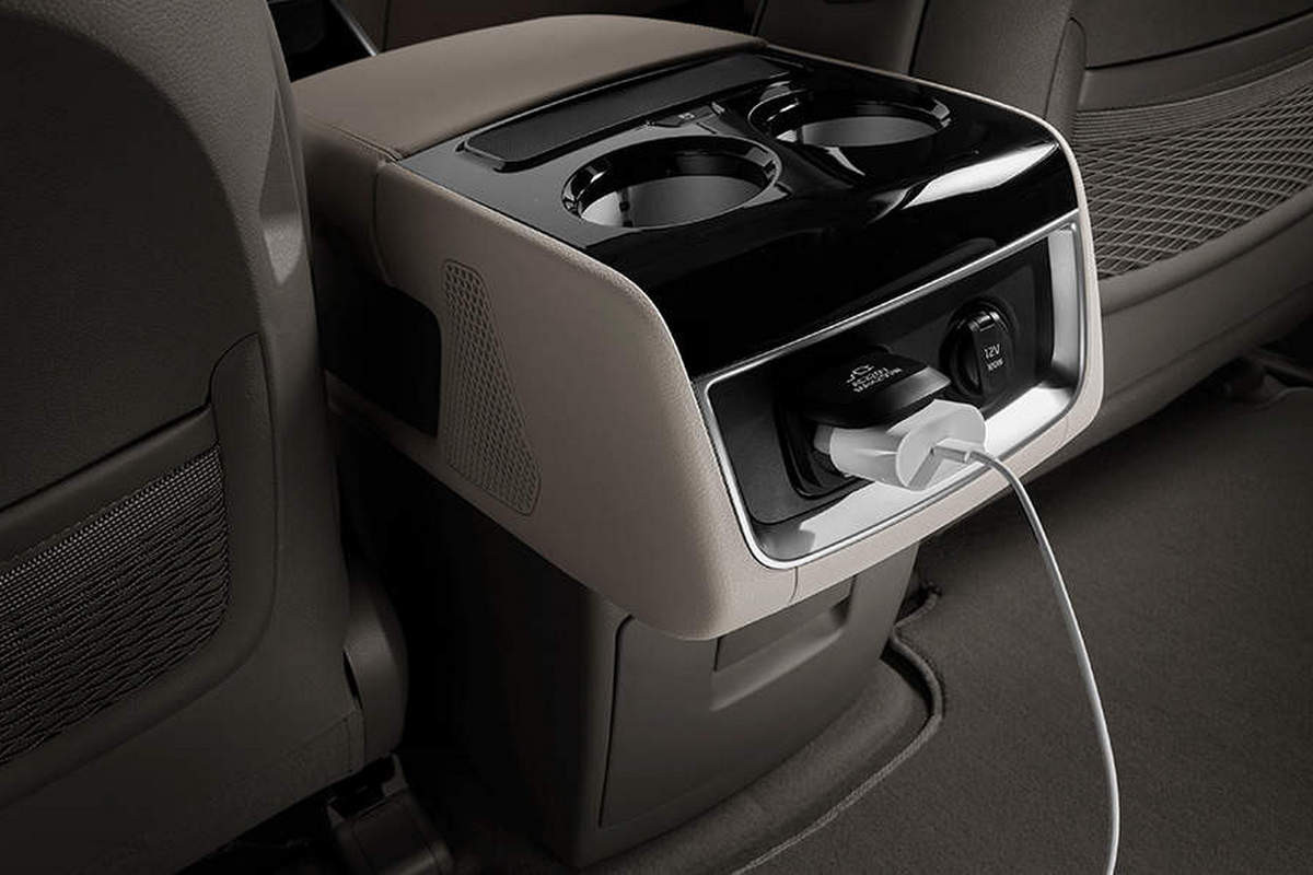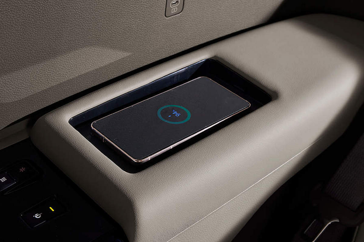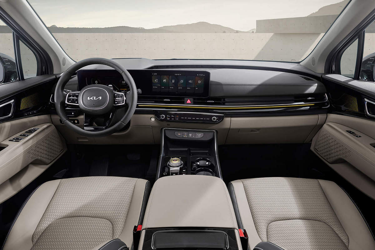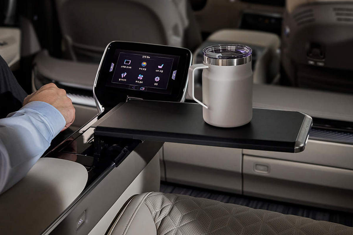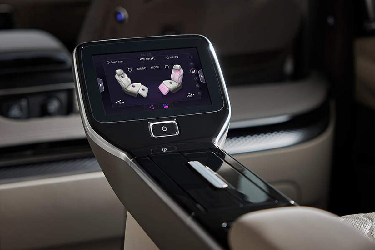 У VIP-версии Carnival в пассажирском отсеке установлены два отдельных кресла с выдвижными подставками для ног и электрорегулировками, оба обиты кожей Nappa. В расположенные по бокам от сидений подлокотники встроены беспроводные площадки для зарядки смартфонов, а между креслами есть пульт – 7-дюймовая сенсорная панель, на которую вывели управление всеми настройками. А еще из центральной консоли может выезжать небольшой столик (он поворачивается направо или налево).
