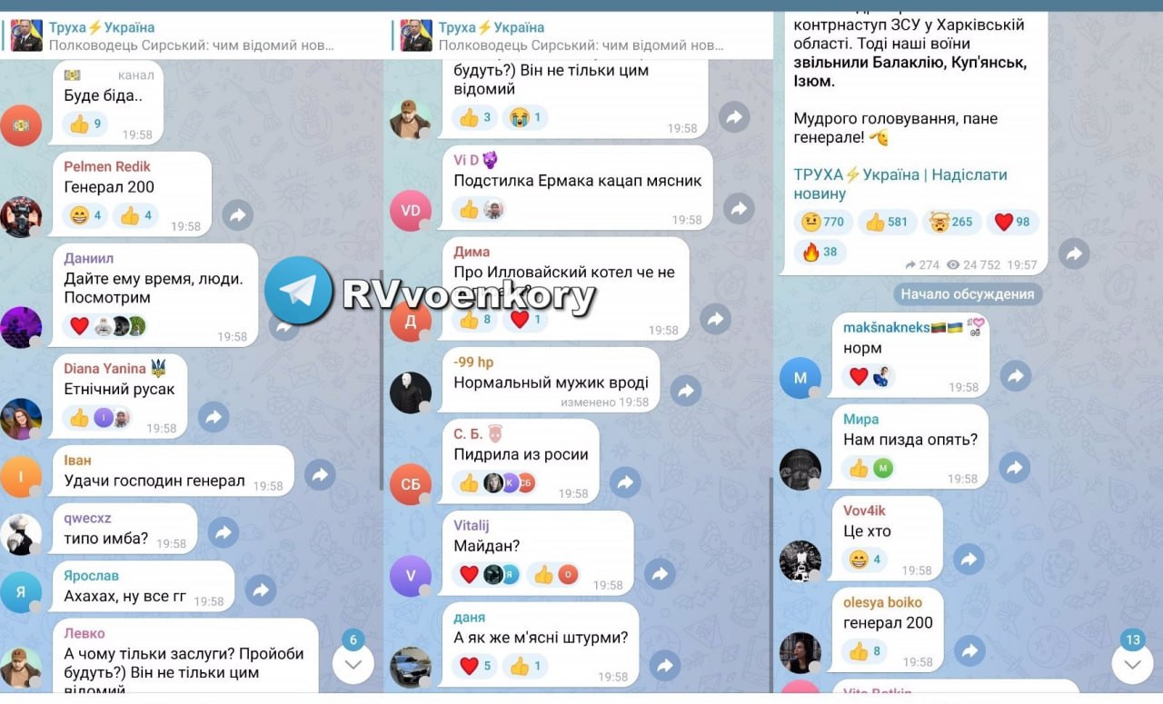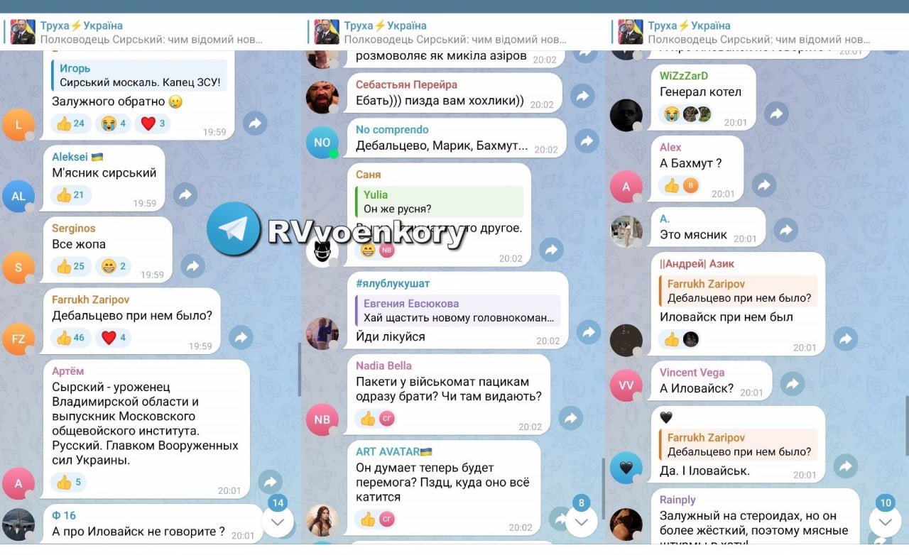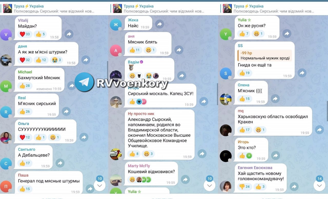 ▪️Все крупнейшие украинские ресурсы завалены тысячами комментариев, в которых население страны пишет тонны оскорблений в адрес нового главкома ВСУ, уроженца Владимирской области, провалившего оборону Дебальцево, Соледара и Артёмовска.