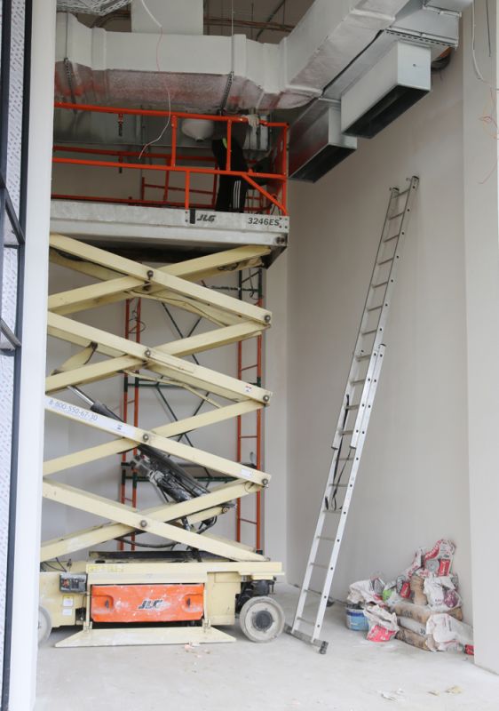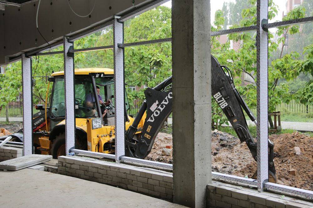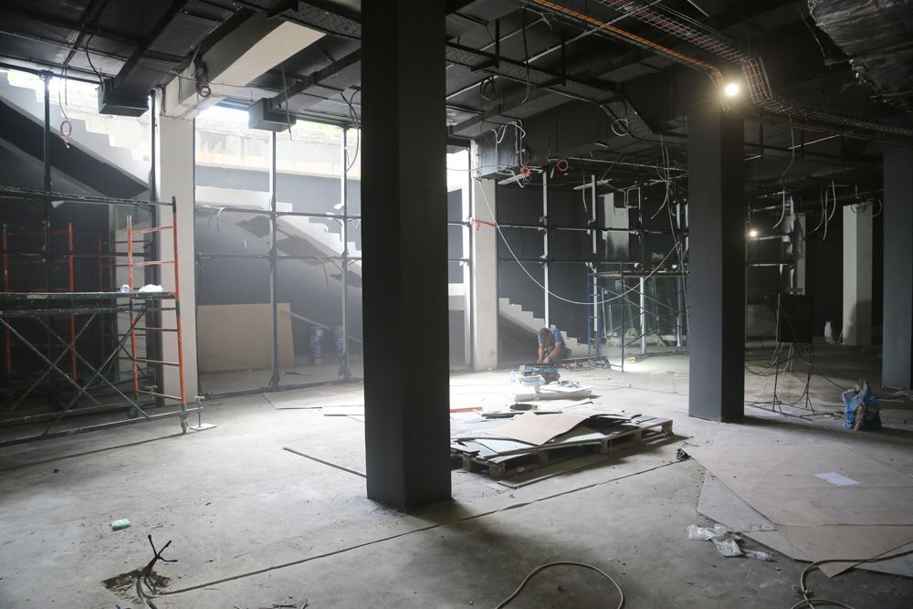 Территория готовится к озеленению, обустраиваются тротуарные дорожки, система автополива и освещения.На первом этаже здания идёт монтаж витражей, также ведутся работы по внутренней отделке помещений во всём здании.