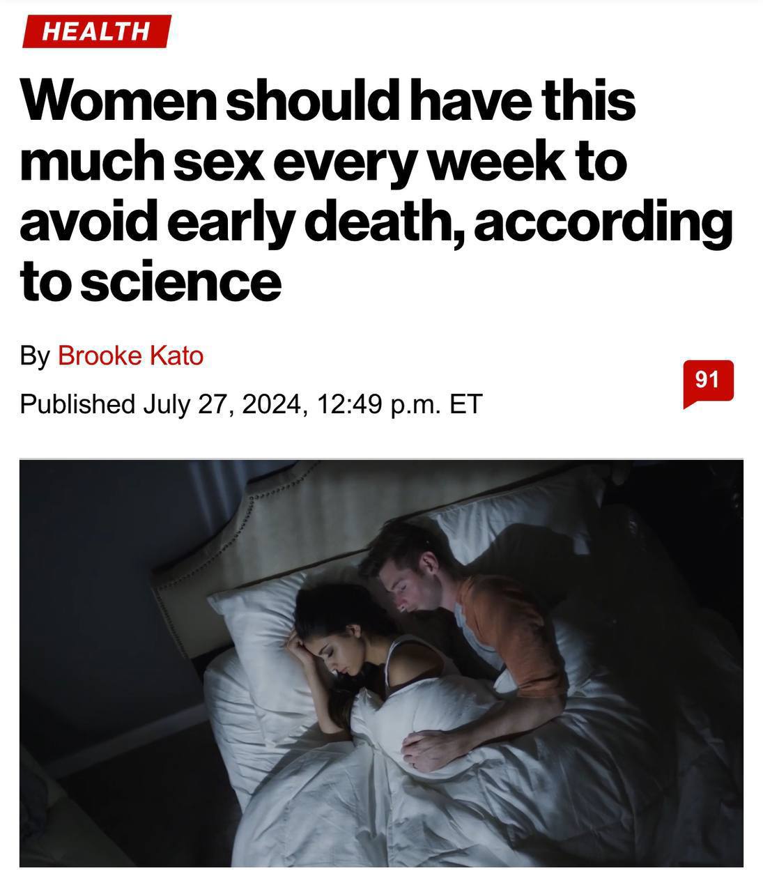 Исследование: для того, чтобы пожить подольше, женщины должны чаще заниматься сексом.Со слов ученых, женщины, которые занимаются сексом реже одного раза в неделю, имеют риск смертности выше на 70%. К тому же у тех дам, которые следуют научному завету ведут активную половую жизнь, проще проходит депрессия. Но работает это только на вуменах, мужики здесь в пролёте.