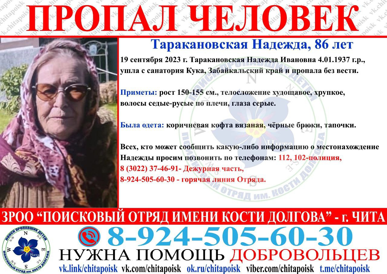 Надежда Таракановская 1937 года рождения потерялась в лесу в районе села Кука в Читинском районе при сборе грибов. На ее поиски отправились добровольцы.