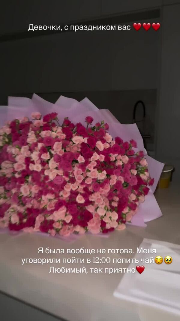 Курбан Омаров тоже порадовал любимую, подарившую ему сына, одним из первых. «Я была вообще не готова. Меня уговорили пойти в 12:00 попить чай. Любимый, так приятно», — растрогалась Валерия, увидев на кухонном столе большой букет разноцветных роз.