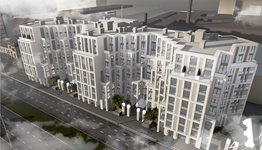 Прежде здесь стоял заводской корпус 1970-х годов постройки. Впоследствии он был снесён. Заказчиком разработки проекта нового здания выступил жилищный застройщик АО "Инвестторг". Проект разработало ООО "Архитектурное бюро “Студия 44”". Вдоль Большой Невки предложено возвести девятиэтажное здание, разделённое на три ризалита (так, скорее всего, больше квартир получают вид на воду). Оно будет лесенкой спускаться к реке.