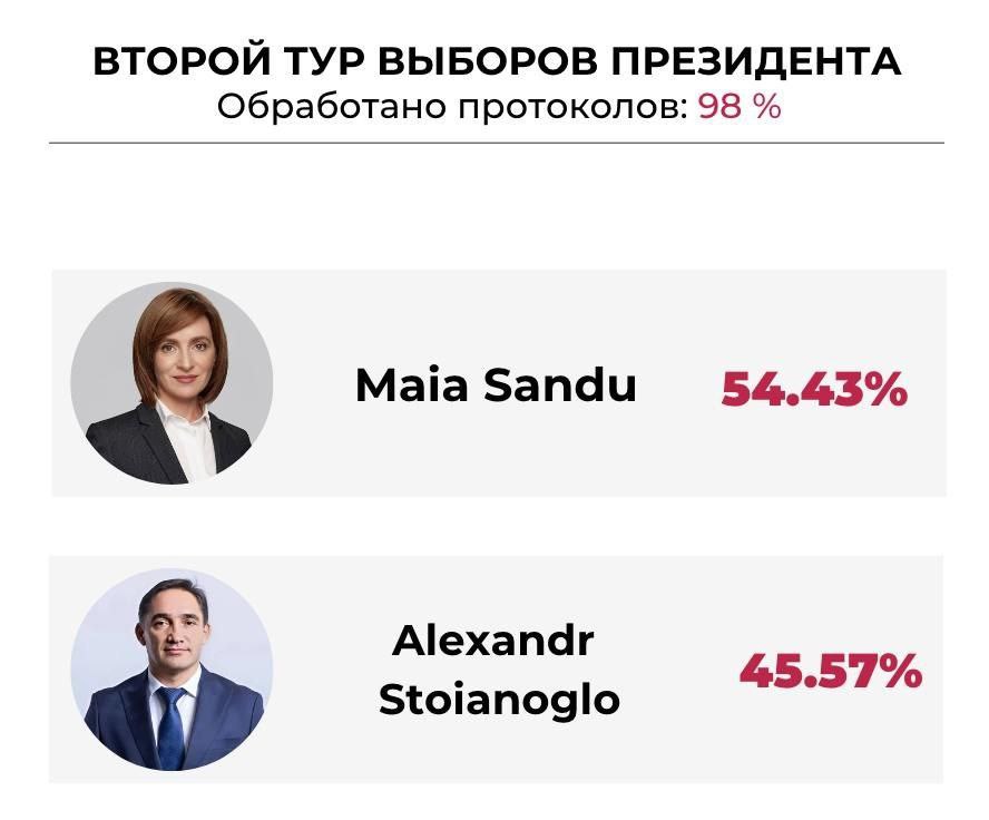 После подсчета 98% голосов Санду набирает 54,43%, а Стояногло — 45,57%, —