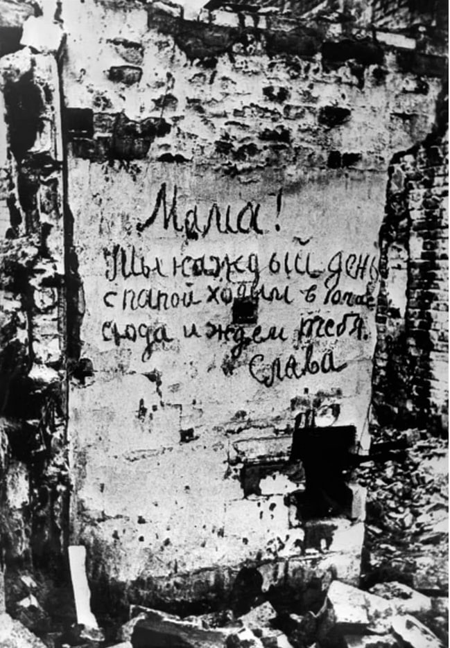 Сейчас эвакуировавшиеся жители возвращаются на родные пепелища, к тому, что осталось от их домов, от их прежней мирной жизни. И, наверное, не на одном доме мы увидим надпись, похожую на ту, что сделал мальчик Слава в 1943 году на стене печи — это единственное, что оставили фашисты от его родного дома.