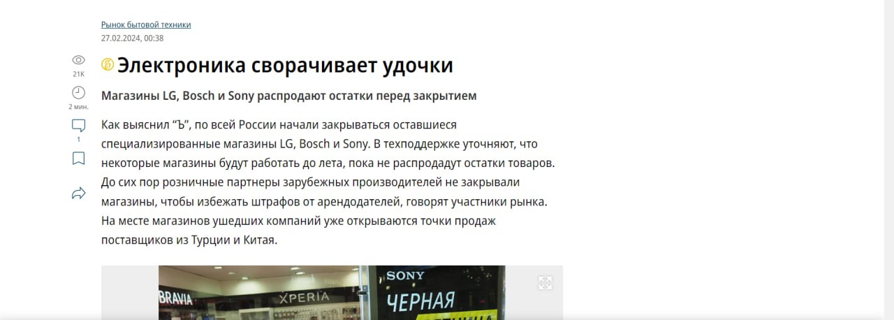 Оставшиеся в России магазины LG, Bosch и Sony начали закрываться. Компании давно заморозили поставки, но магазинам оказалось выгоднее дождаться конца аренды, чем расторгать договоры.