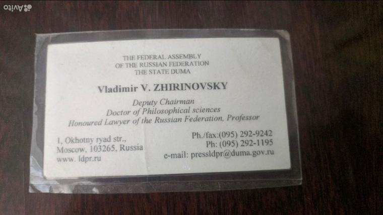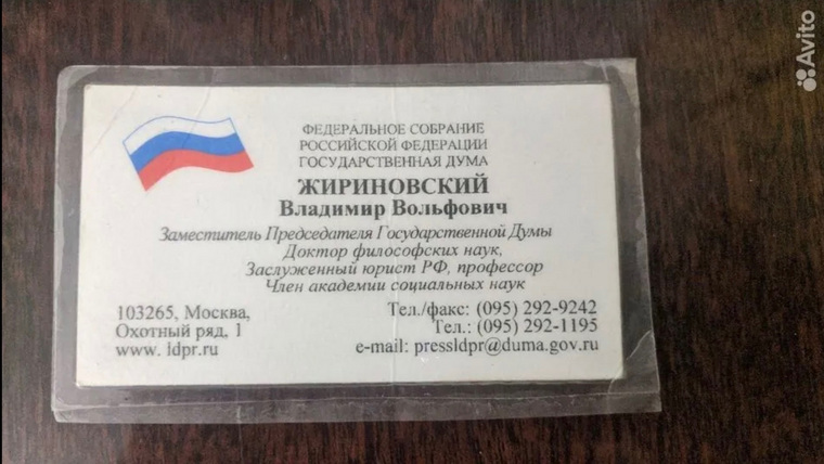«Визитная карточка Жириновского В.В. 2000 год. Была получена от него в руки и тут же заламинирована», — указано в объявлении. Цена — 10 миллионов рублей.