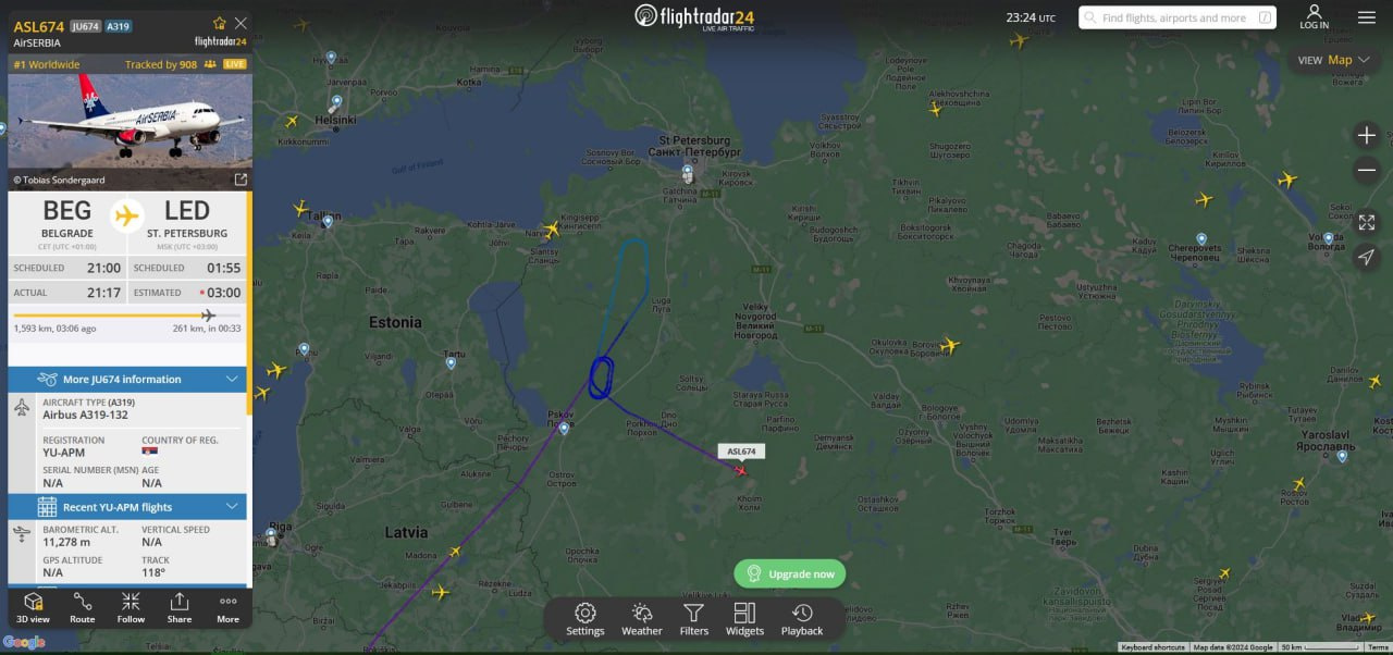 Тем временем, самолет из Москвы рейс SU52, который должен был сесть в Петербурге в 2:30 кружит в районе Ладожского озера. Также круги в районе Псковского озера нарезает рейс Air Algerie.
