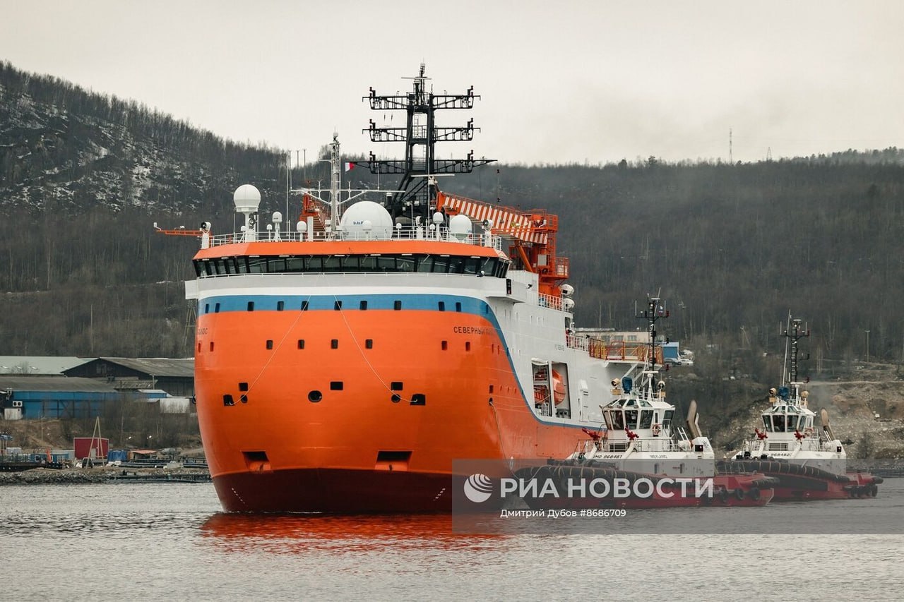 Ледостойкая самодвижущаяся платформа (ЛСП) "Северный полюс" в порту Мурманска.