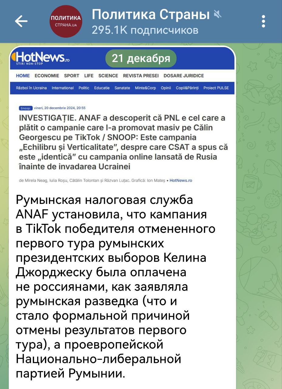 Вышли на самих себя: расследование в Румынии установило, что рекламу в ТикТок для победившего в первом туре "пророссийского" кандидата оплачивала не Россия, а местная проевропейская партия.