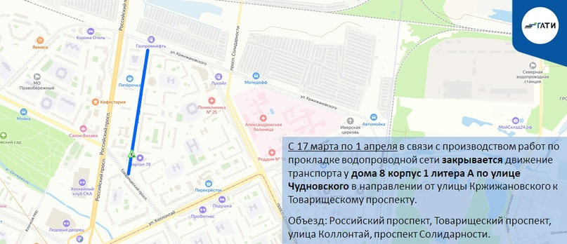 С 17 марта по 1 апреля для прокладки водопроводной сети перекроют движение у дома 8, корпус 1, литера А по улице Чудновского в направлении от улицы Кржижановского к Товарищескому проспекту. Объехать участок можно будет по Российскому и Товарищескому проспектам, улице Коллонтай и проспекту Солидарности.