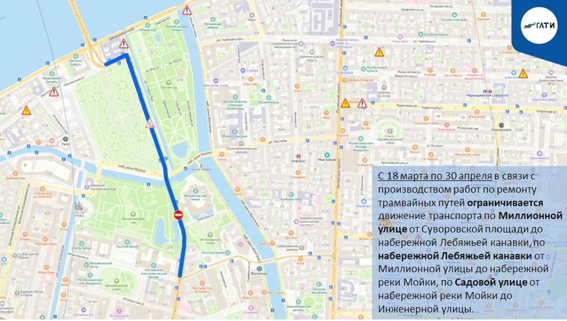 С 18 марта по 30 апреля ограничат проезд по Миллионной улице от Суворовской площади до набережной Лебяжьей канавки, по набережной Лебяжьей канавки от Миллионной до набережной Мойки и по Садовой улице от набережной реки Мойки до Инженерной улицы. Там будут ремонтировать трамвайные пути.