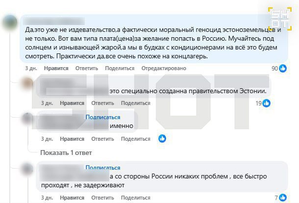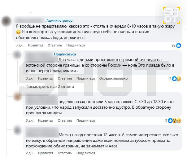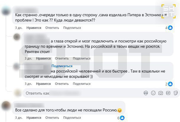 Прибалты отмечают, что российские пограничники никак не препятствуют проходу в Эстонию. А в сторону России можно простоять 8–10 часов: «Мучайтесь под солнцем. Вот вам типа плата за желание попасть в Россию»; «Два часа простояли с детьми в огромной очереди на эстонской границе, со стороны России — ноль»; «Всё сделано для того, чтобы люди не посещали Россию».