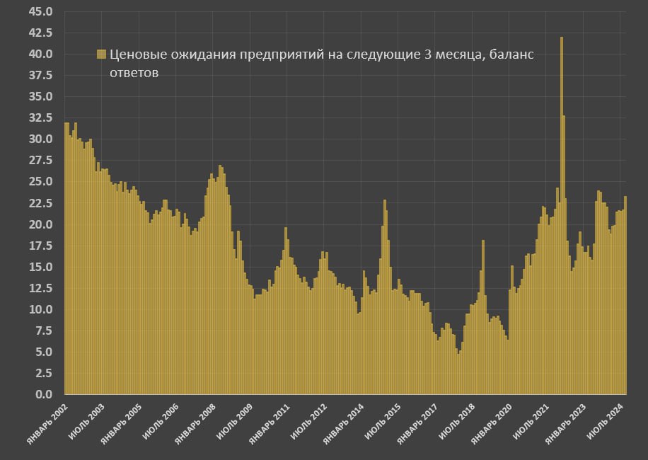 ▪️Ценовые ожидания предприятий выросли до максимумов с осени 2023 и начала 2022, когда формировался пик инфляционного давления, но сейчас вновь разгон. Инфляционные ожидания растут по всем секторам экономики, кроме строительства и частично в сегменте производства потребительских товаров.