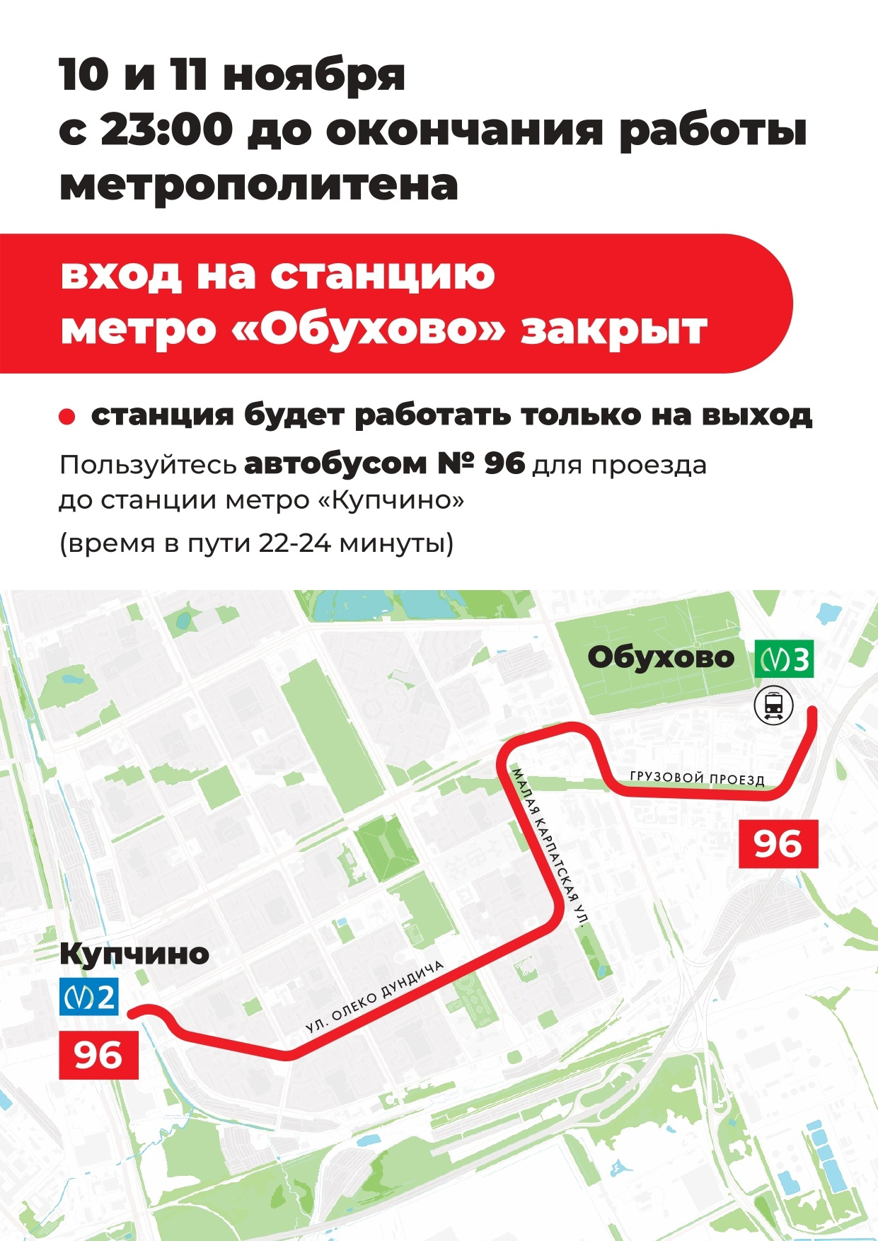 В пятницу и субботу, 10–11 ноября, наземный вестибюль метро «Обухово» с 23:00 и до окончания работы станции будет закрыт для входа пассажиров. В качестве альтернативы пассажирам предлагают воспользоваться автобусом №96, чтобы доехать до станции «Купчино». На выход «Обухово» будет работать как обычно.