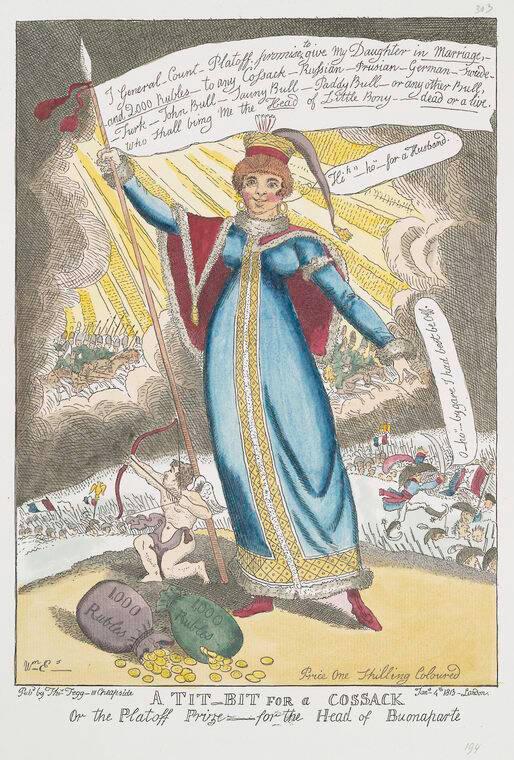 Английская гравюра с элементами лубка, выполненная в жанре политической карикатуры. В центре композиции фигура девушки, одетой в наряд, видимо, по мысли автора, соответствующий традиционному русскому платью. У ее ног — два мешка с деньгами и купидон, стреляющий из лука в никуда. На стяге в правой руке девицы — текст посула Донского атамана Платова.