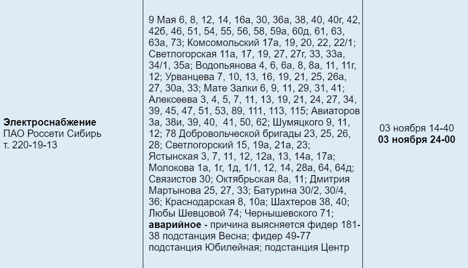 Подстанция принадлежит «Россети-Сибирь». По информации компании, в работе подстанции «Весна-2» произошел технологический сбой, поэтому часть Взлетки и Северного осталась без электричества. Бригады уже работают на месте и переподключают по резерву всех, кого можно.