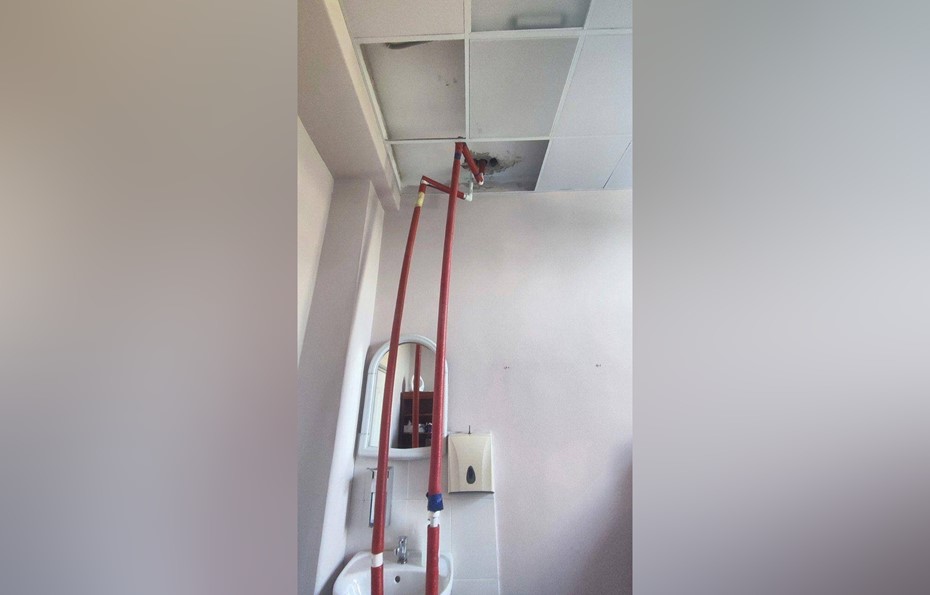 Снимки, сделанные в помещениях медицинского учреждения, появились в социальных сетях утром 9 июня. На них видно, как водопроводные трубы, в частности, мешают пройти к раковине, "протыкая" потолок или пересекают порог одного из кабинетов.