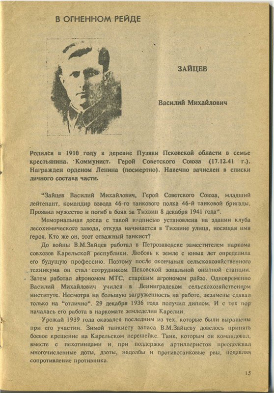...Зайцев остался и стрельбой из пулемёта помогал своим товарищам отбивать вражеский натиск. Он стрелял до тех пор, пока видел цель, пока руки были в силах держать оружие. Младший лейтенант Зайцев В. М. так и сгорел в своём танке, не выходя из боя, накануне дня освобождения Тихвина от гитлеровских захватчиков