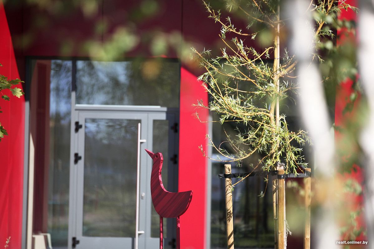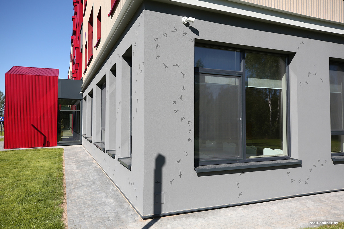 Здание детского сада построили прямо возле леса: лицевым фасадом оно смотрит на жилые кварталы, а вот «бэкярд» обращен на деревья (так и будет, пока не вырастет обещанный государством Зеленый Бор). Возводить постройку с танцующим силуэтом начали прошлой весной. Тогда же рассказали, что проект «привязан» к пернатому миру: называться садик будет «Птичий дом», а вход окажется стилизован под гнездо.