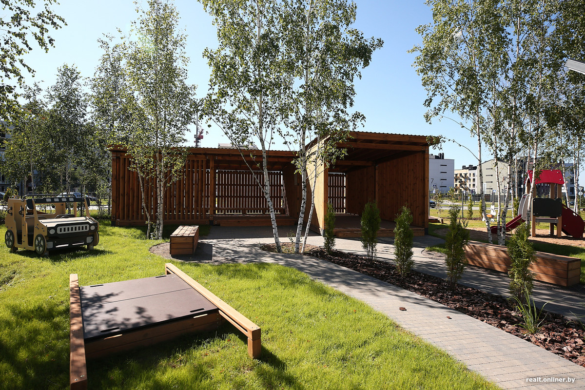 Обустройство двора тоже с «отсылками». А еще здесь очень зелено и уютно: все взрослые деревья сохранены, разнотравье засеяно. И даже для убежденных интровертов предусмотрены свои уголки.