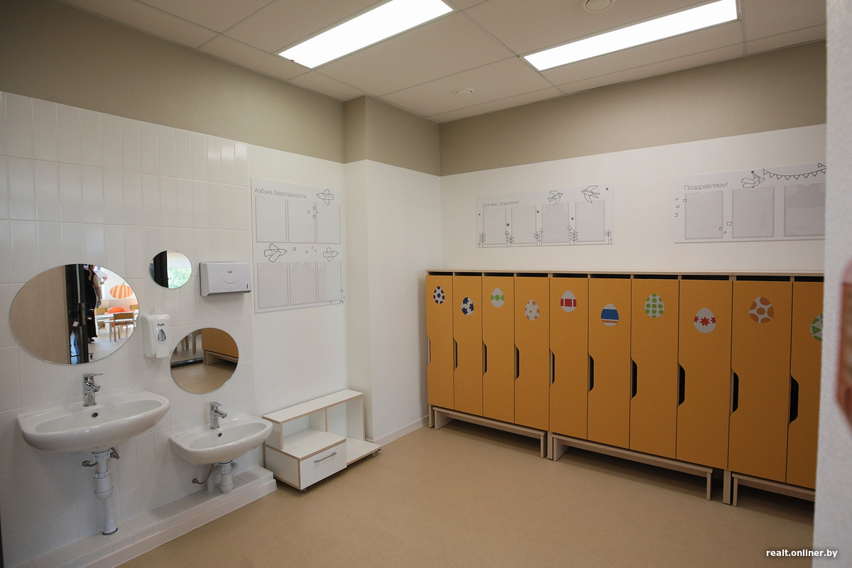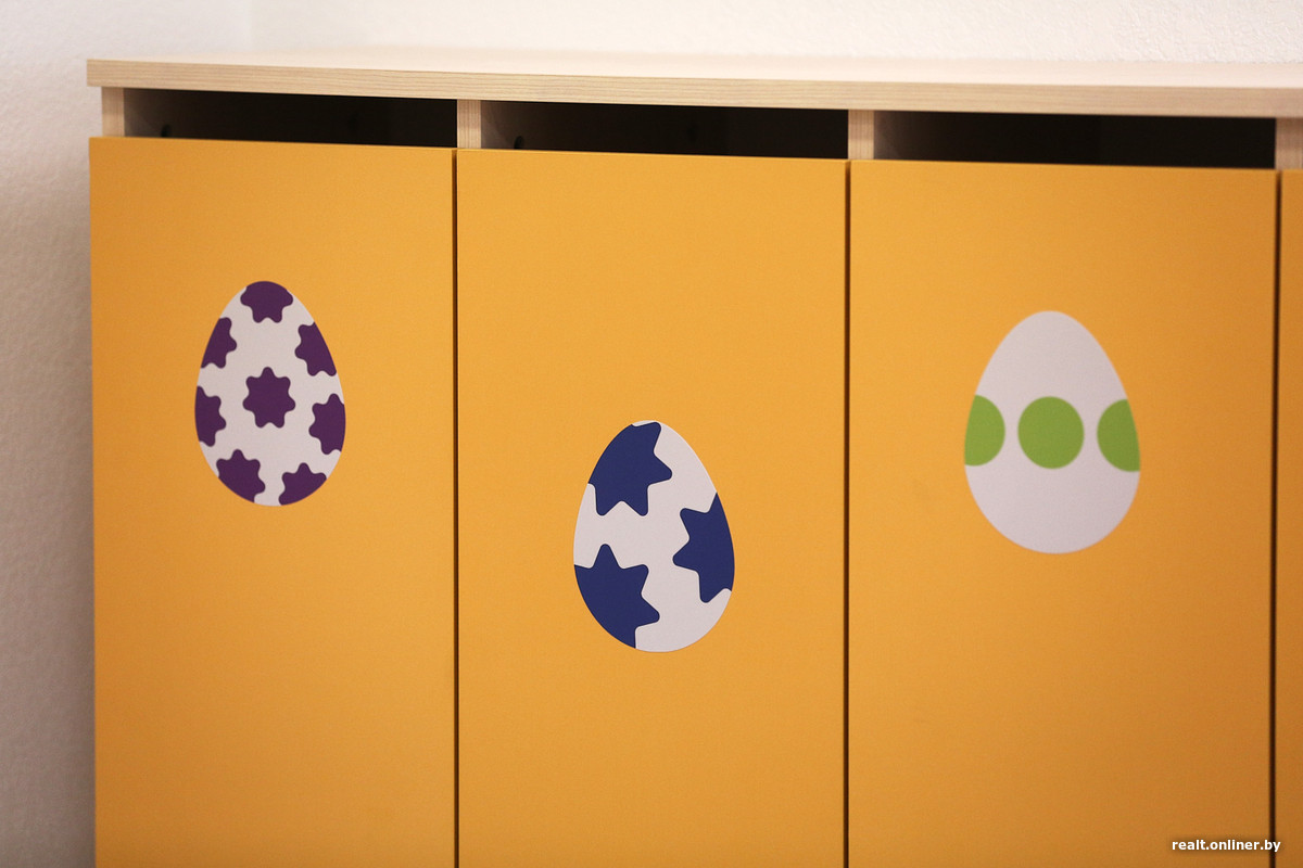 Площадь типовой группы (всего их в саду 12) — около 90 квадратных метров. Пространство условно разделено на несколько зон. Встречает детей (и их родителей) раздевалка с персонализированными шкафчиками (узоры на яйцах не повторяются). Шкафчики, к слову, с подогревом — осенью и зимой не придется забирать «сырого» ребенка из сада.