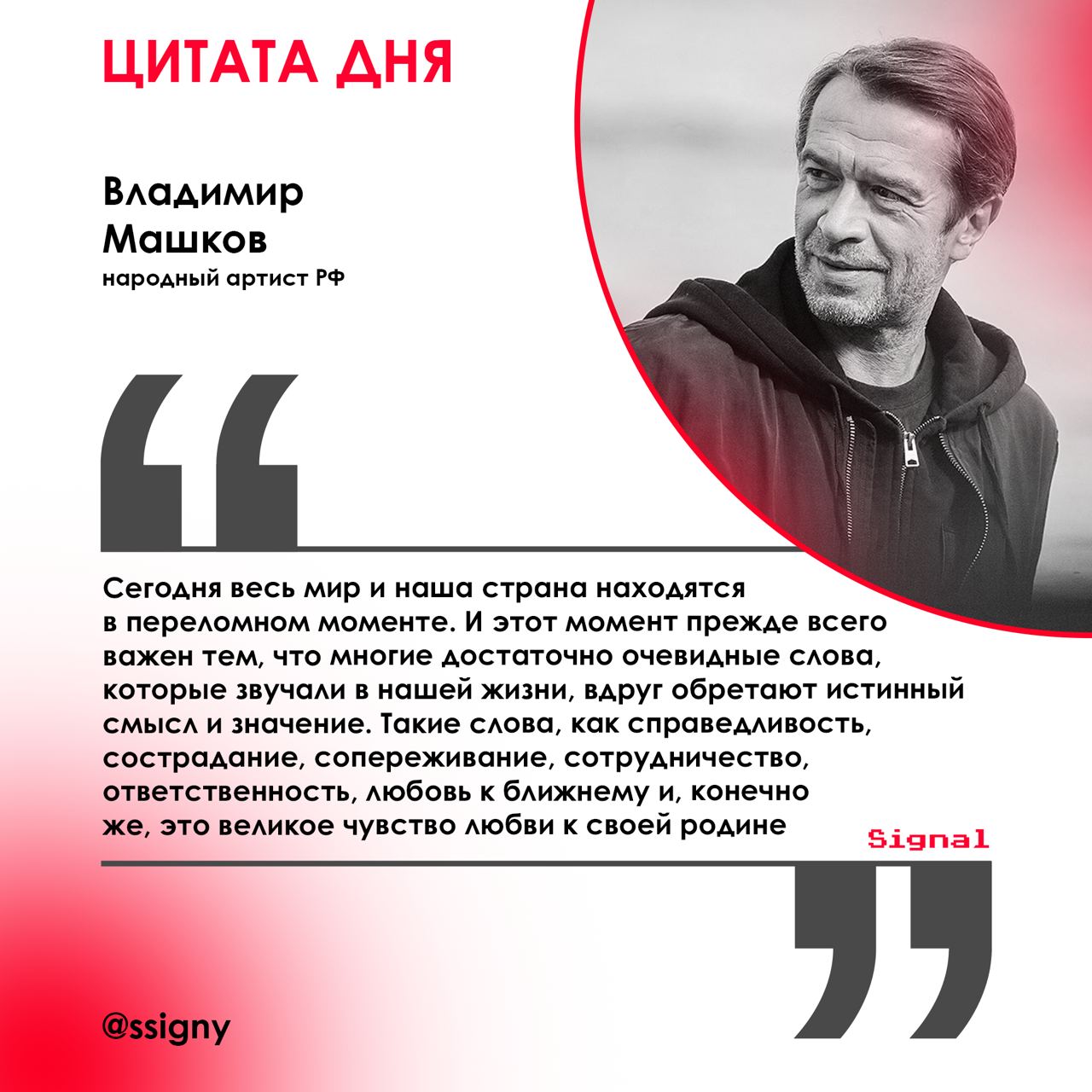 Сопредседатель избирательного штаба кандидата в президенты РФ, действующего главы государства Владимира Путина, народный артист РФ Владимир Машков заявил на заседании второго всероссийского форума партийного проекта "Женское движение "Единой России", что мир и Россия сейчас находятся в переломном моменте, жителям страны необходимо сплотиться перед лицом попыток отменить все русское. Также, по словам Машкова, в России исторически сложилось так, что в самые сложные периоды жизни ее "народ вставал плечом к плечу и побеждал, несмотря ни на что".