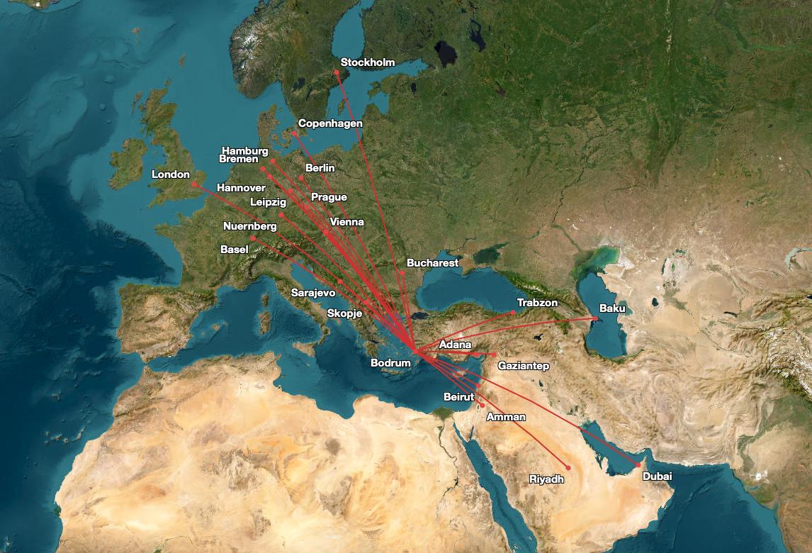 Ранее турецкие СМИ сообщали, что авиакомпания с открытием базы будет выполнять из Бодрума чартерные рейсы в Берлин, Гамбург, Ганновер, Бремен, Нюрнберг, Лейпциг, Копенгаген, Стокгольм, Базель, Вену, Прагу, Бухарест и Лондон.