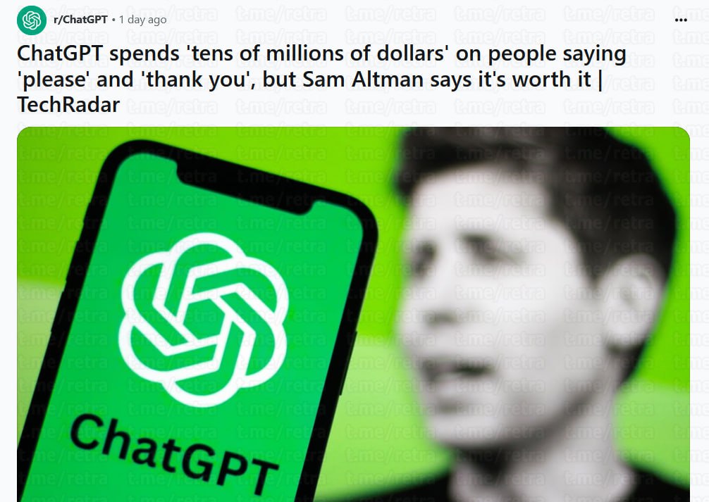 Вежливость пользователей ChatGPT обходится OpenAI в десятки миллионов долларов из-за затрат на электроэнергию.