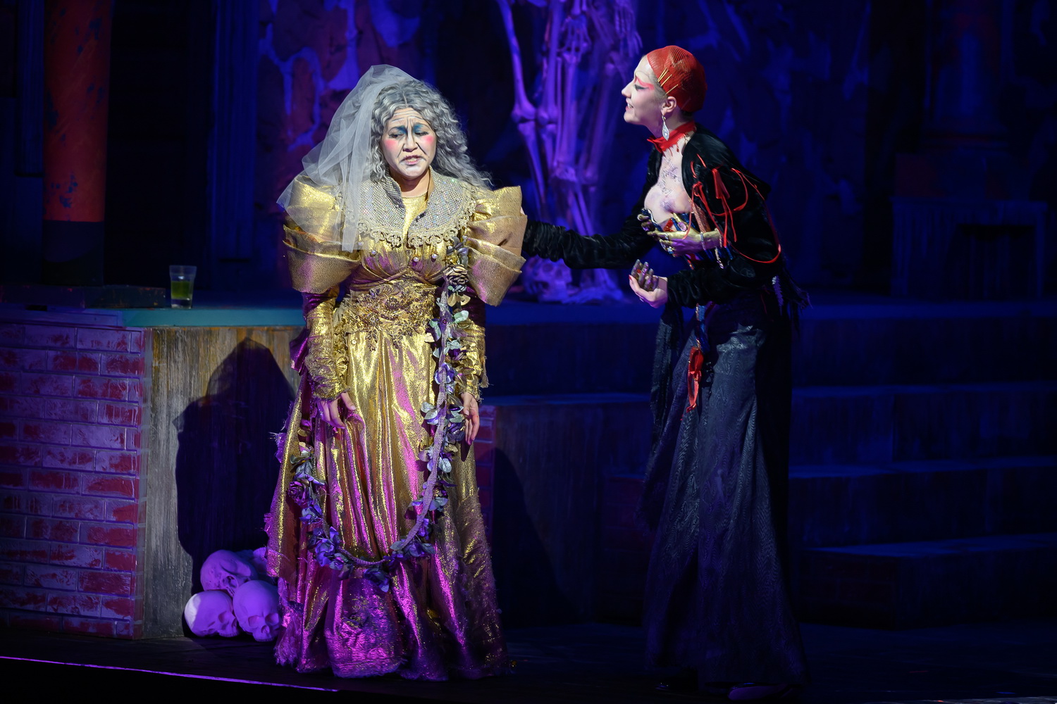 Что касается постановки – понравилась сценография, такой оммаж барочному театру – пышному, позолоченному, но с мотивами vanitas: колонна из скелетов, груда черепов в углу, гроб в центре, квазибарочная сцена с разномастными колоннами, на которой разворачивается аллегорический театр, – ну да, прием не нов, но работает. Видео было какое-то невнятное, что-то там мельтешило вверху (невозможно было разглядеть из-за нависавшего потолка).