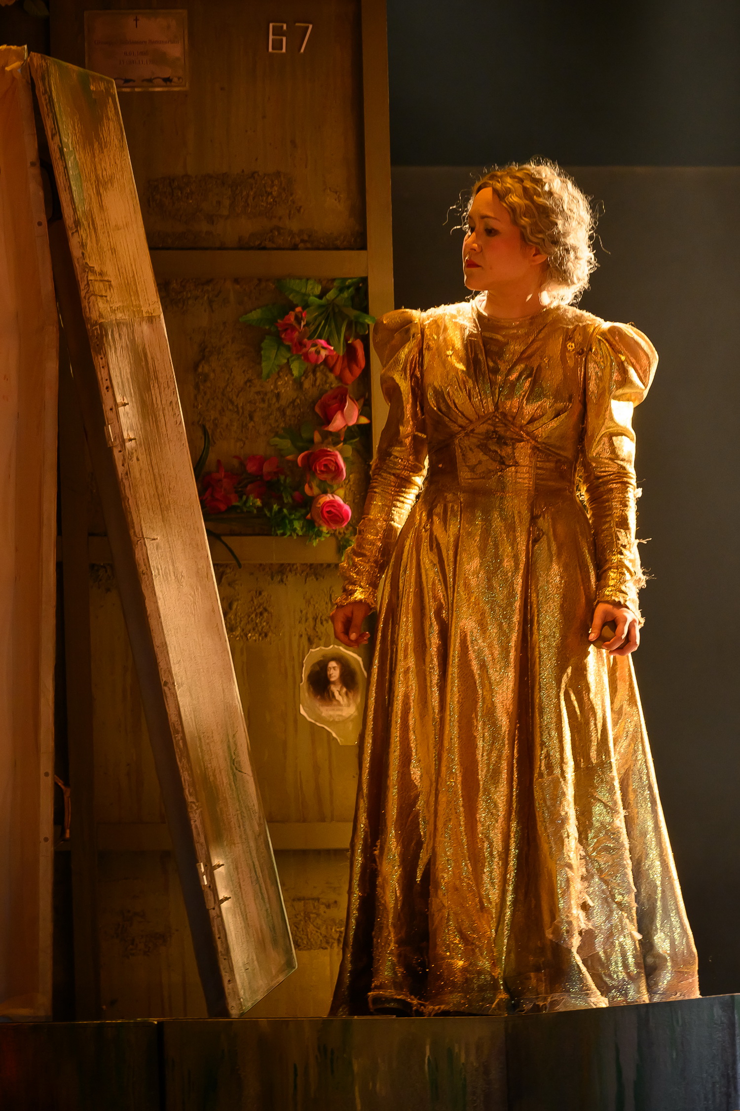 Однако задача поставить «Триумф» для тех, кто смотрит условного Триера, умное кино, а об опере знает, что какой-то Вагнер звучал в «Меланхолии», разбивается о воплощение. Оно, как и Красота, застряло где-то в лимбе между бурной фантазией и недостаточной смелостью. Начать можно с костюмов. Сергей Илларионов создает четко считываемые маски – увы, предсказуемые и неизобретательные. Если Красота наряжена в огромное золотое платье из «дешевой» ткани, то Наслаждению достался сложный костюм: самая его запоминающаяся деталь – это корсет c накладными золотыми руками, сжимающими грудь, который при всей эксцентричности выглядит как «первое, что можно представить по теме». Наслаждение изысканно-вульгарно, Красота примитивно красива, Время и Разочарование не отличить друг от друга в стильных лохмотьях. Складывается впечатление, что образы разрабатывали несколько человек и не могли решить, шокируют они или держатся в рамках ожиданий.