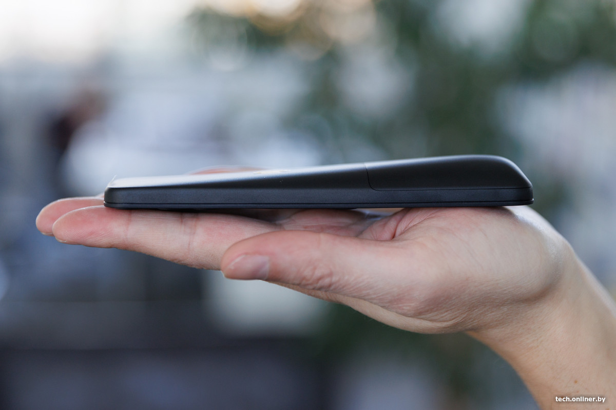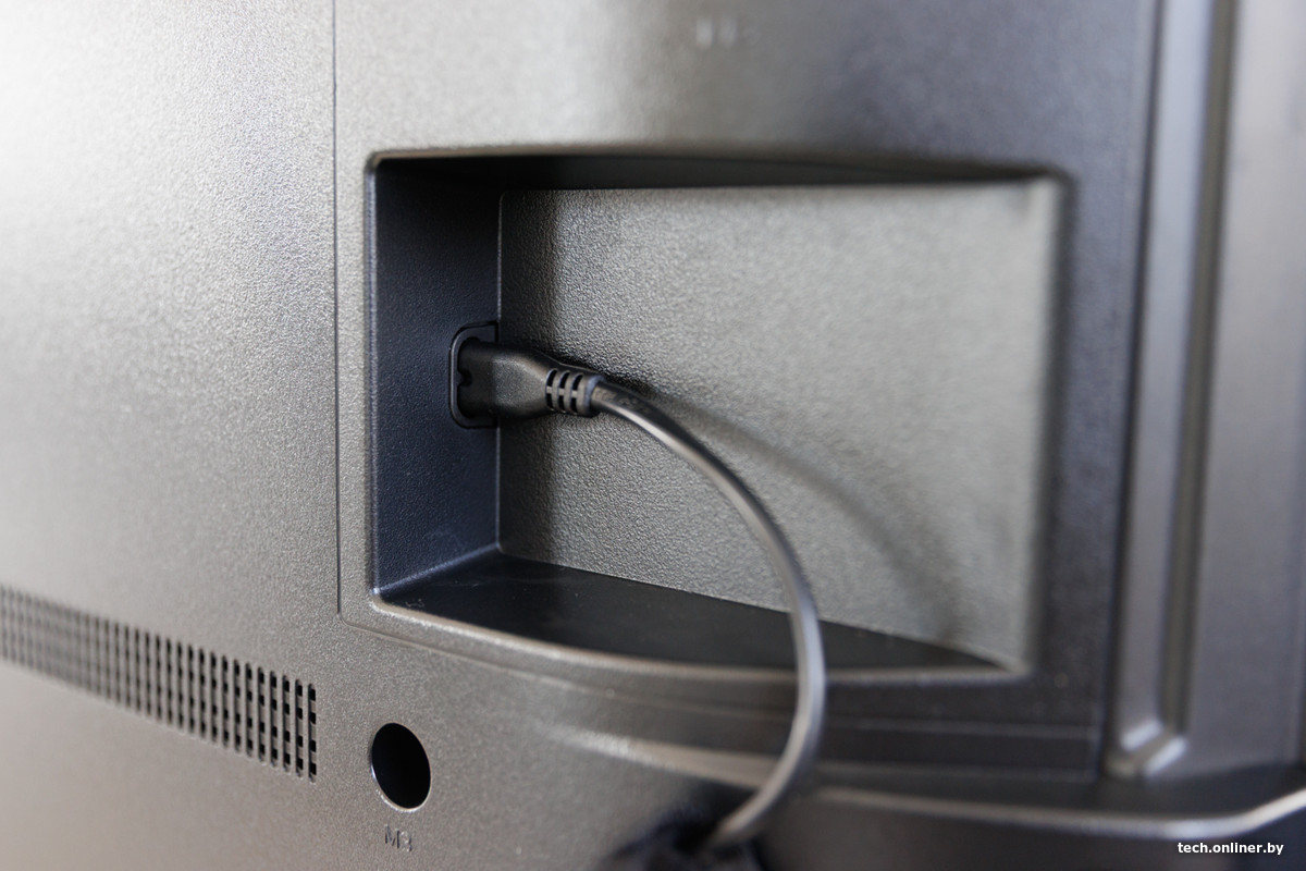 Толщина корпуса — тоже из разряда «стандарт». Верхняя половина тоньше, основные компоненты прячутся в нижней, которая шире. На ней же — отверстия под VESA-крепление. Подобная ступенчатая конструкция не позволит повесить телевизор на стену без зазора, а на «подоконнике» со временем соберется немало пыли. Но кто туда заглядывает?