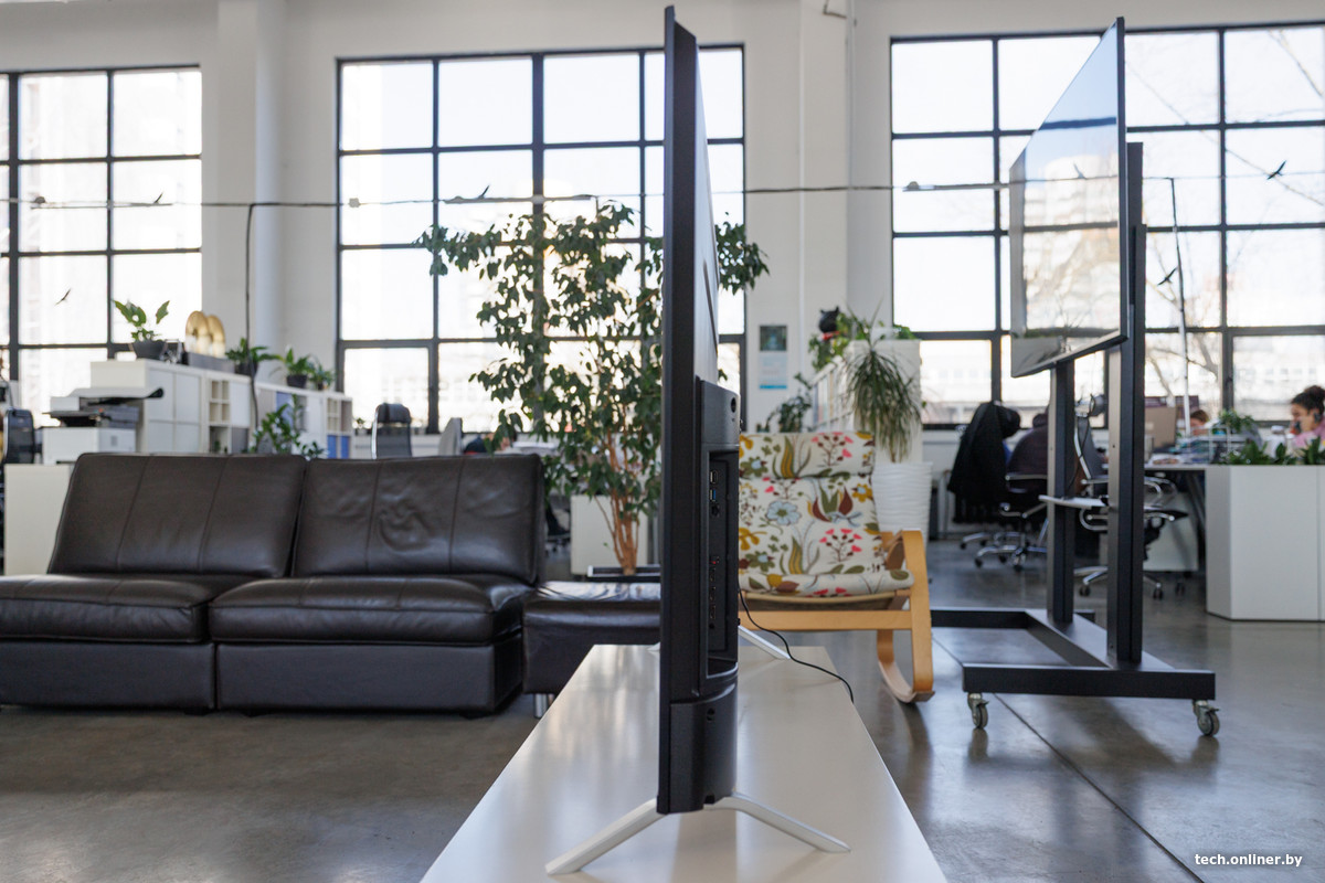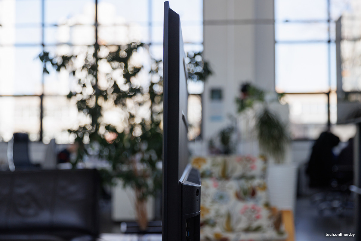 Что действительно бросается в глаза, так это ножки. Опоры серебристого матового цвета становятся акцентом на фоне черного глянцевого экрана и выглядят, как кроссовки с брюками. Но это дело вкуса — вероятно, в определенном антураже эстетические чувства не пострадают.