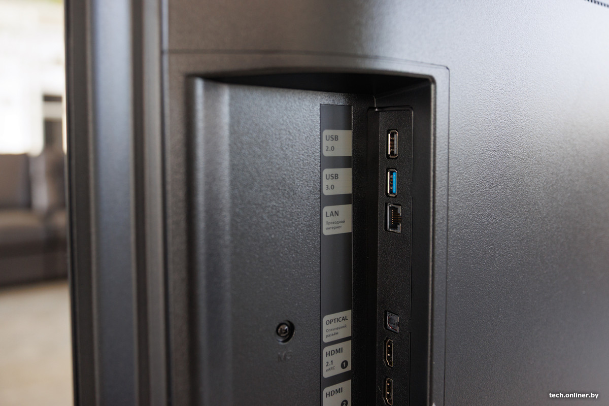 Разъем питания размещен слева (когда телевизор экраном направлен на зрителя) на задней панели в нише, справа симметрично в таком же углублении — набор разъемов: 3,5-мм для наушников, три HDMI (подпись 2.1 eARC есть только у одного), оптический, Ethernet и пара USB (один — 2.0 и один — 3.0). Пластик задней панели качественный, не барабанит, в том числе за счет видимых ребер жесткости — все красиво (но вы этого не увидите).