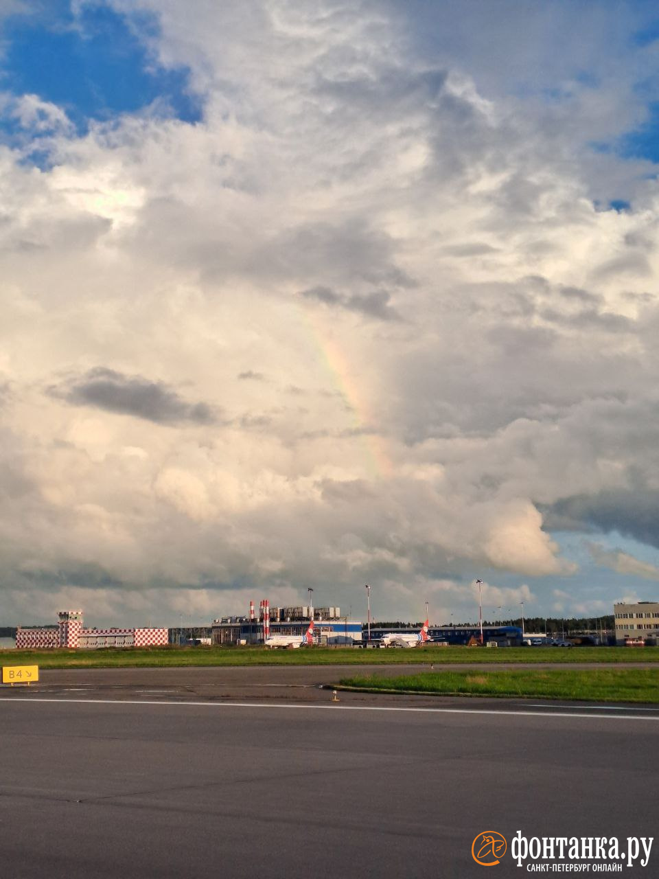 Для бегунов специально перекрыли взлетную полосу. Погода выдалась идеальной для того, чтобы любоваться зданиями аэропорта и взлетающими вдалеке самолётами. В небе их приветствовали и радуга, и гало.
